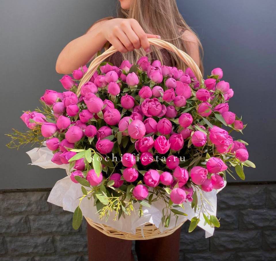 555 роз, зелень (папоротник или эвкалипт, в зависимости от сезона) оформление в корзину. Длина надписи не должна превышать 4 букв.