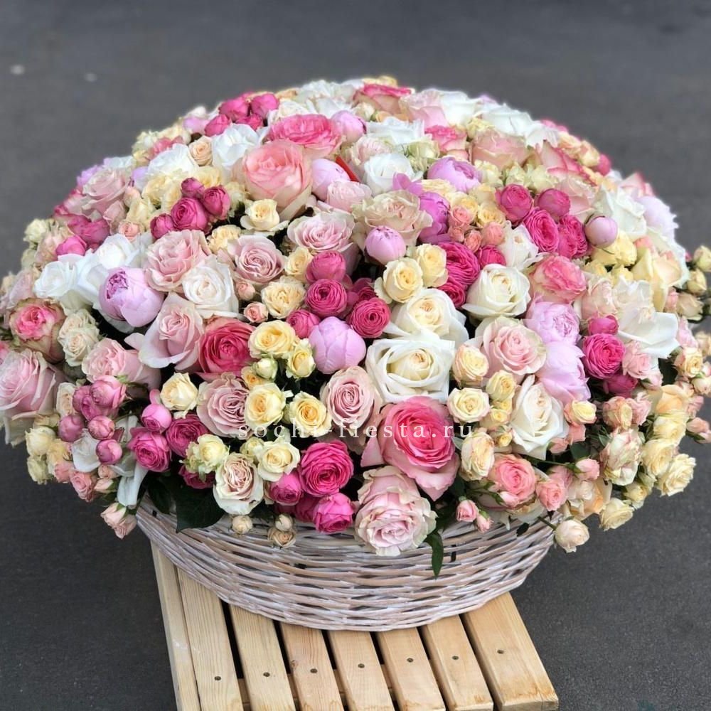 кустовые розы, одноголовые розы, диантусы,  гортензия, эустома, антиринум, озатамус, хризантема, герберы, лента, светлая корзина.Состав может меняться в зависимости от сезонности.