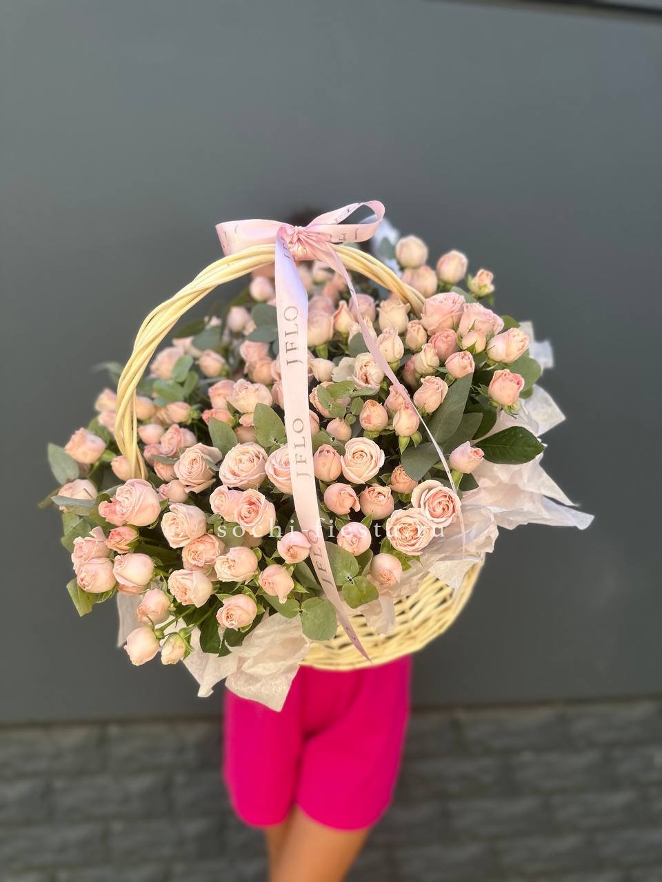 Эта роскошная интерьерная корзина — настоящее воплощение цветущего сада, наполненного нежностью и свежестью. Она выглядит невероятно объемной и фактурной благодаря гармоничному сочетанию классических и экзотических цветов.
