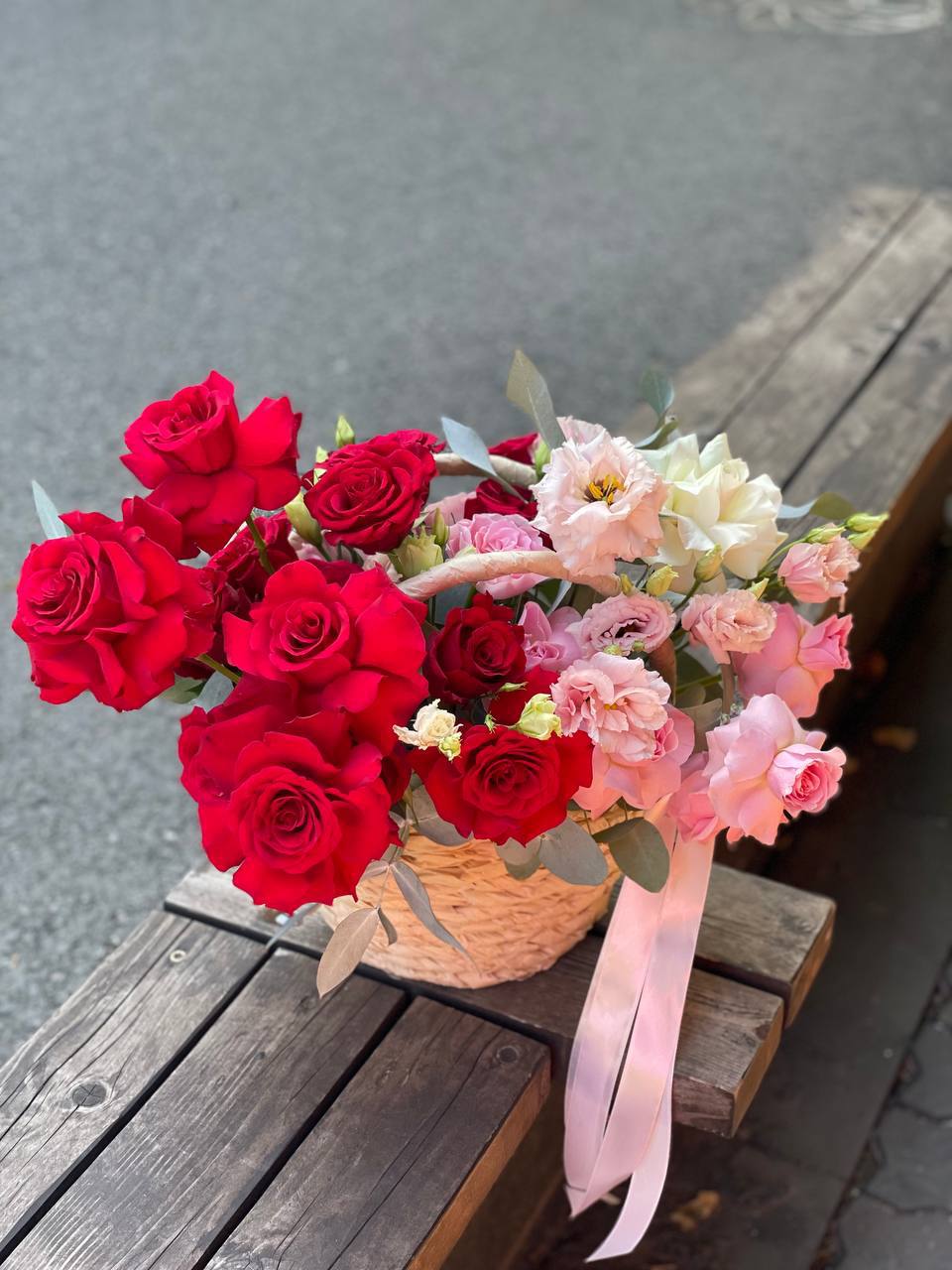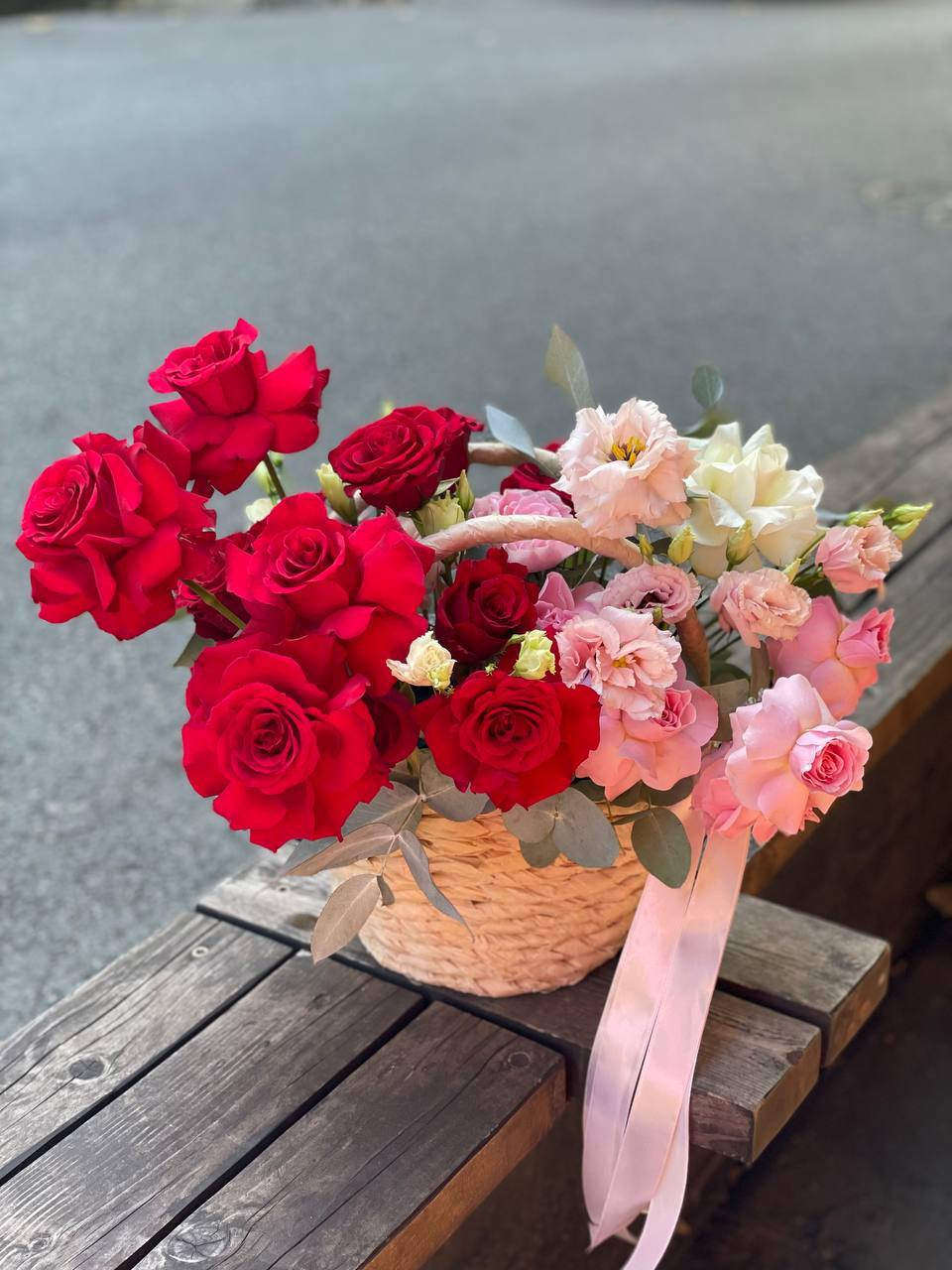 Пышная корзина с розами и гортензией раскрывается мягкими переходами розовых тонов. Эустома и диантус добавляют воздушности, а эвкалипт создает свежую основу для многослойной композиции. Авторская работа для важных событий и значимых встреч.