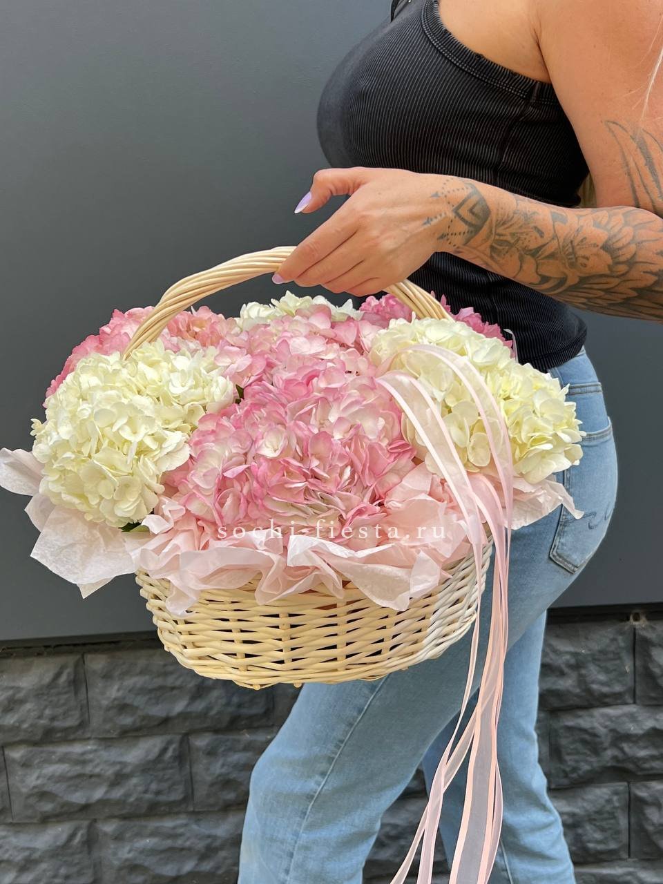 Радужный каскад из девяти видов цветов собран в плавный переход оттенков от холодных до теплых тонов. Гортензии создают объемную базу, а герберы и антирринум добавляют вертикальные акценты.