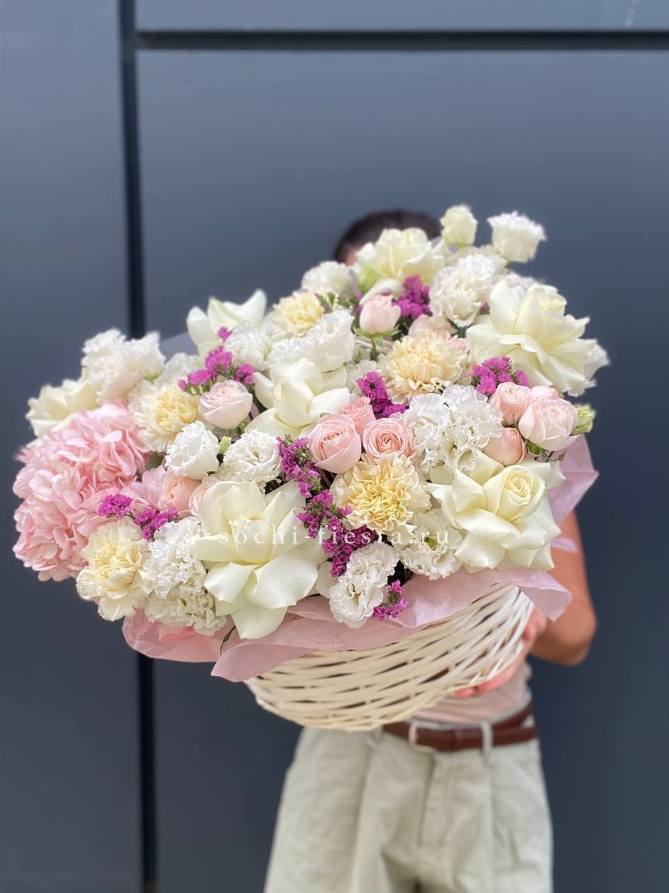Плотная россыпь кустовых роз и эустомы создает живую текстуру с множеством мелких бутонов. Диантус добавляет воздушности, а эвкалипт собирает композицию в завершенную форму. Корзина позволяет разместить букет на столе без дополнительной вазы.