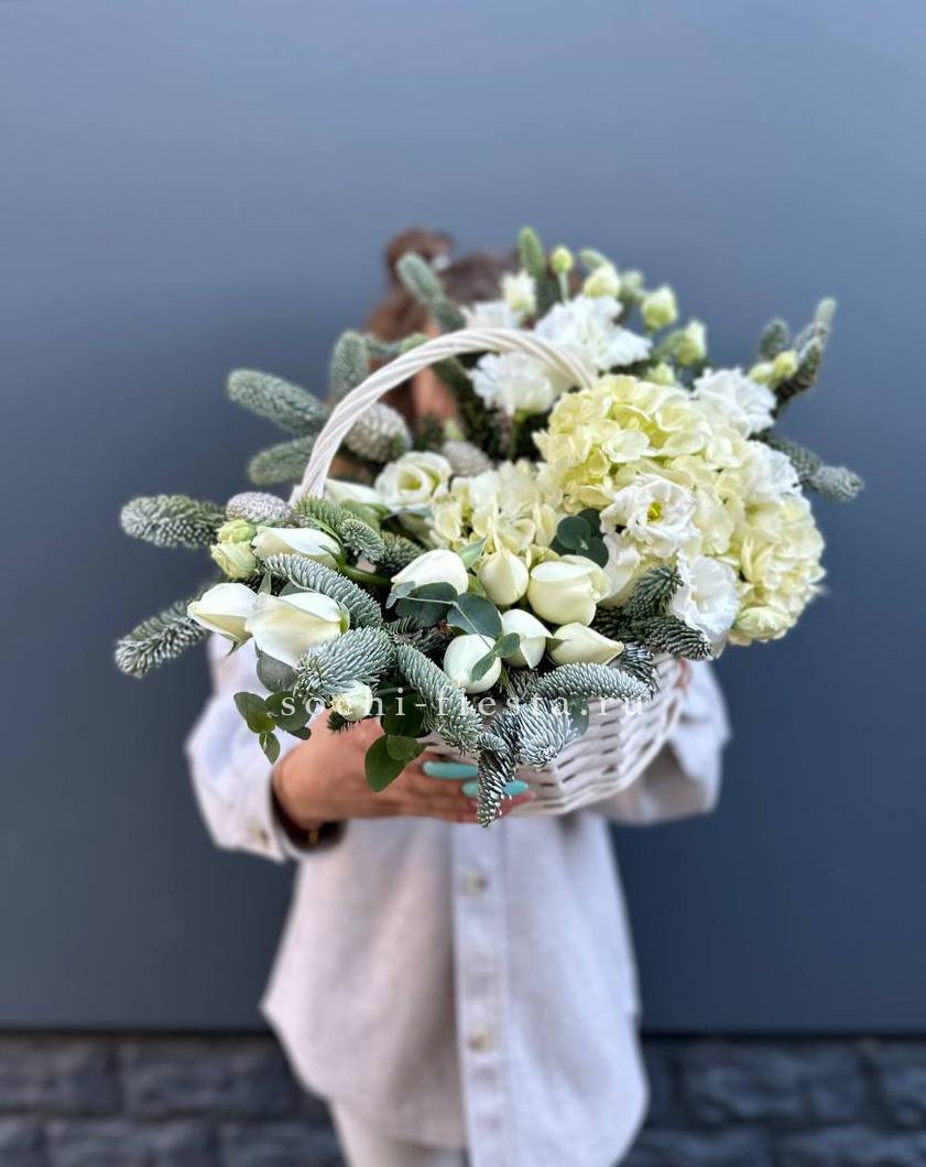 Белоснежные розы и эустома соседствуют с воздушными соцветиями гортензии среди хвойных веток. Корзина объединяет цветочную свежесть и праздничную атмосферу в удобной форме.
