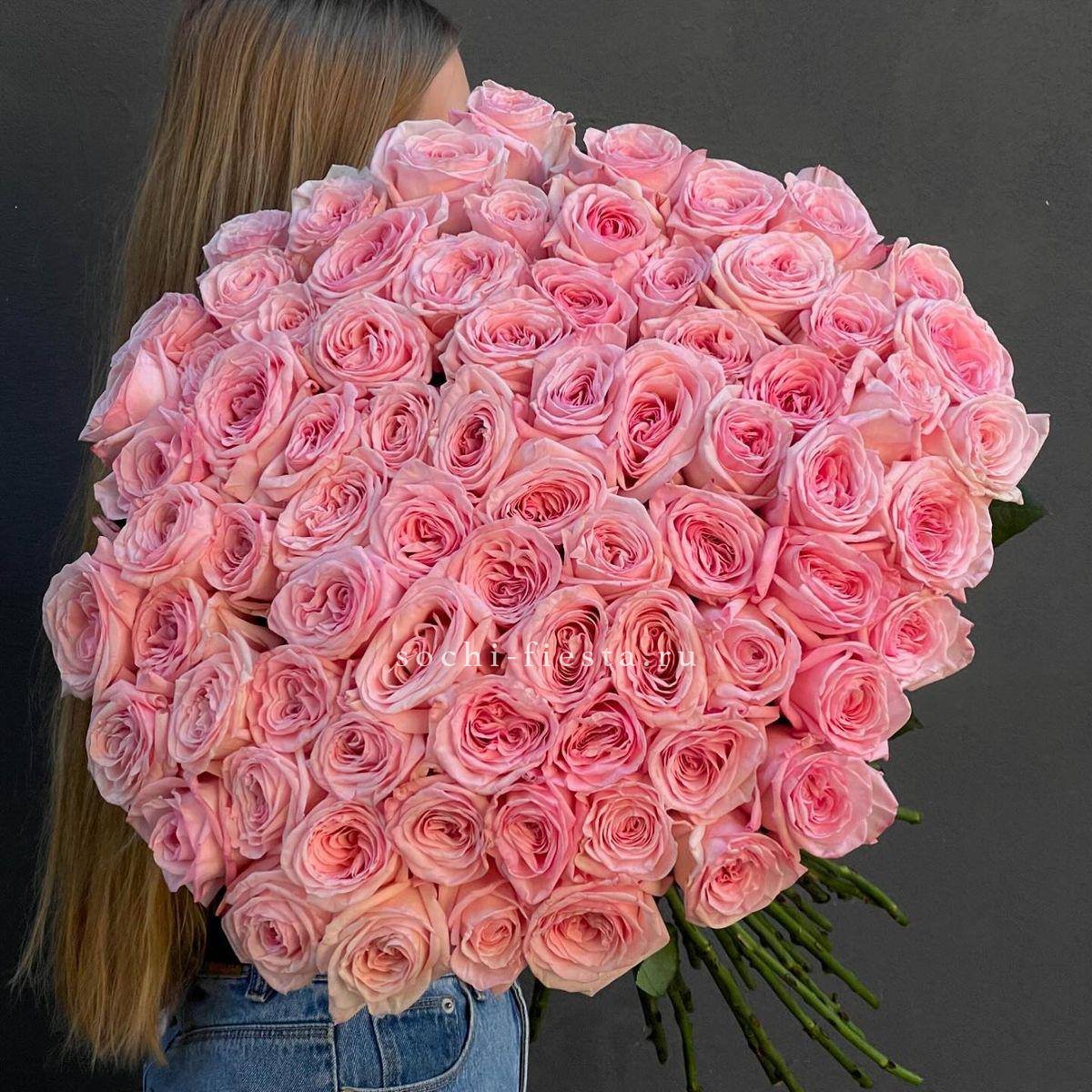 Сто одна белая роза собрана в впечатляющую охапку. Монохромная гамма и повторяющийся ритм бутонов создают мощное визуальное присутствие. Такой объём заполняет пространство и приковывает внимание.