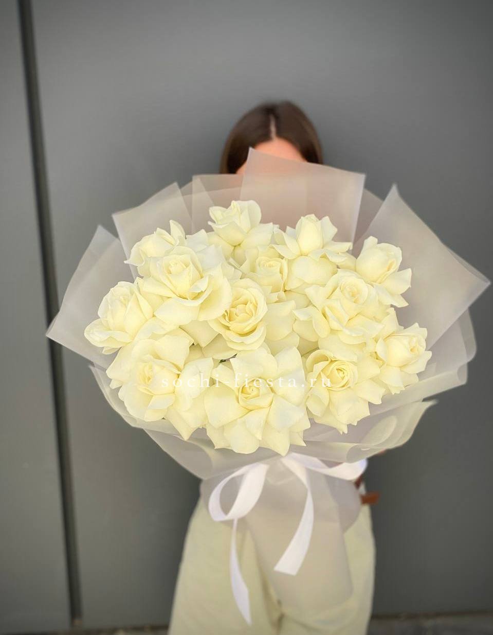 19 белых роз, лента, крафт.