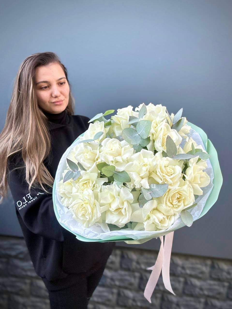 Тридцать пять белых бутонов образуют плотный монохромный ансамбль. Классическая форма и чистота оттенка позволяют букету звучать самодостаточно в любом интерьере.