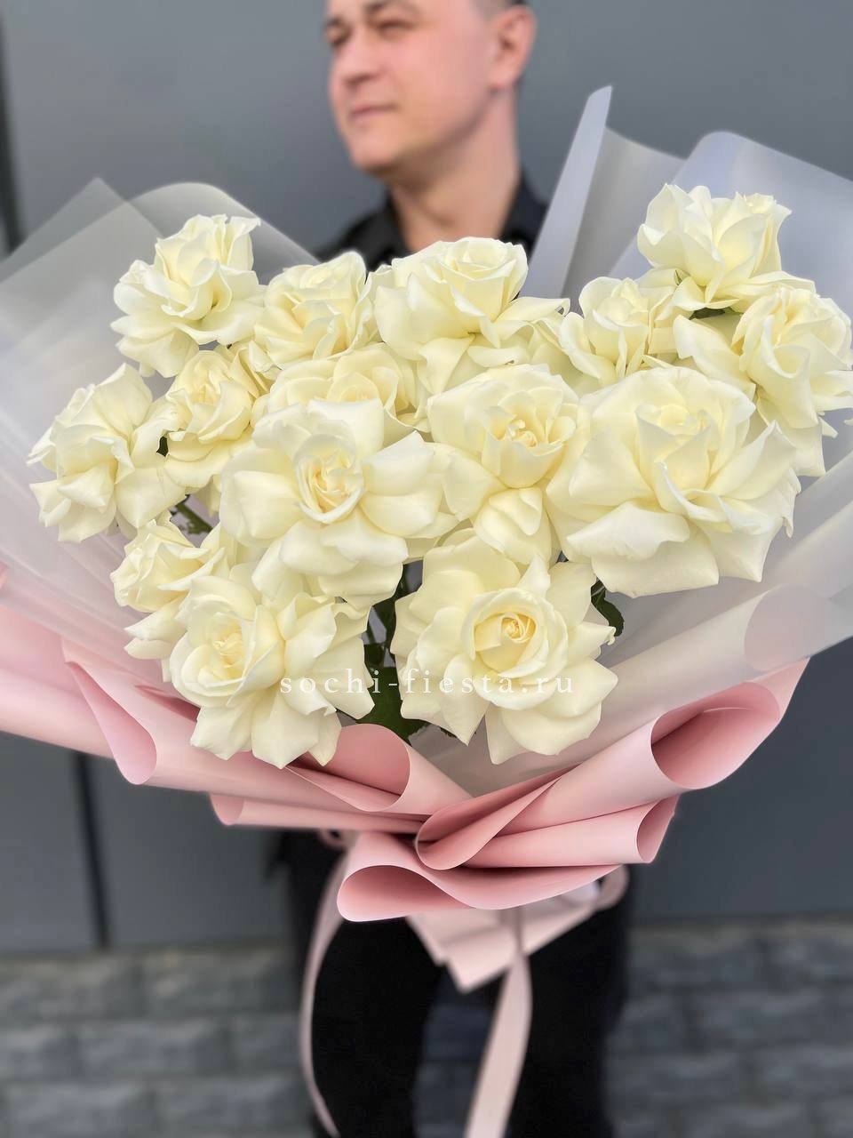 Пятнадцать вывернутых роз White Dream раскрываются широкими головками с волнистыми лепестками. Белый цвет переливается от молочного до холодного снежного оттенка.