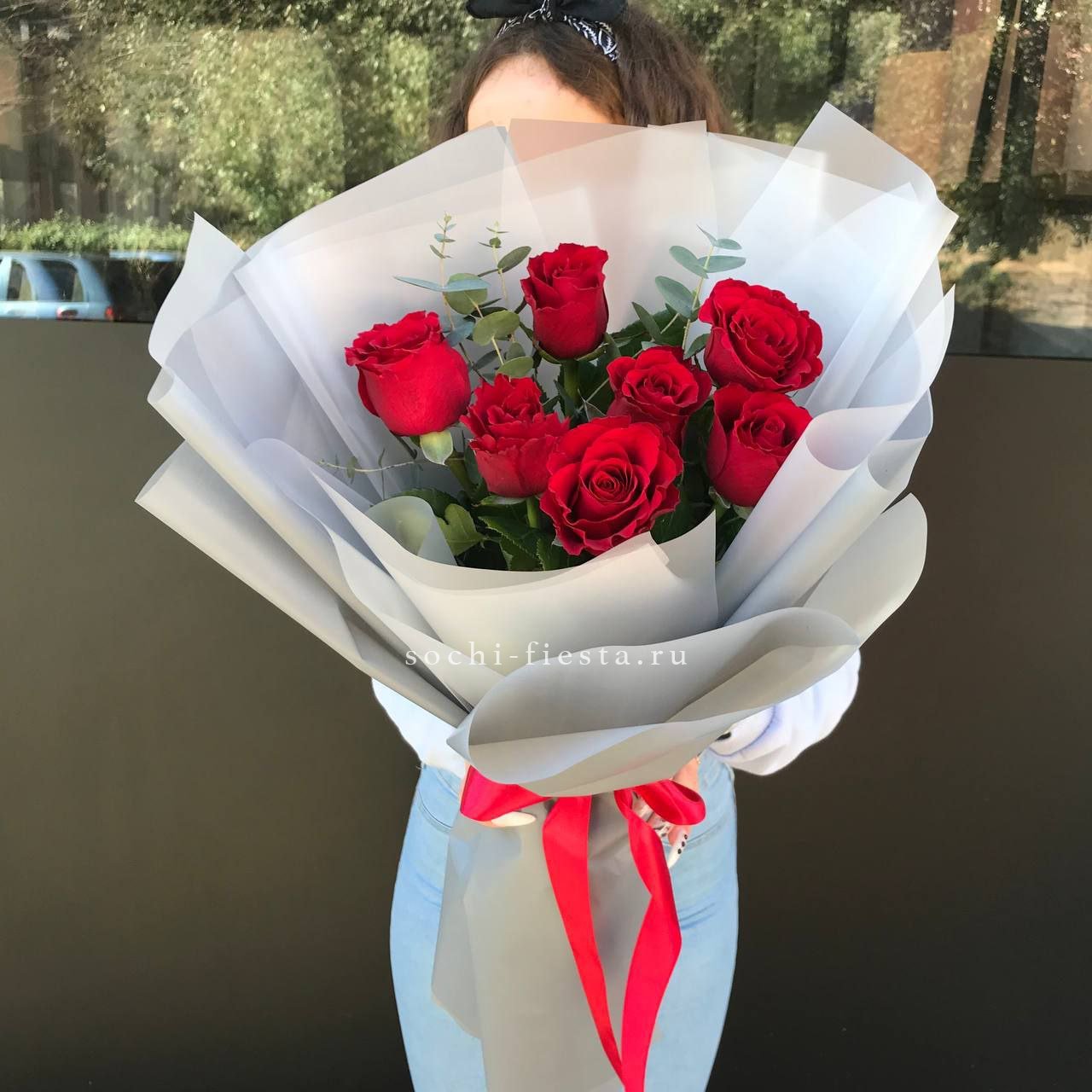 Для заказа товара "7 красных роз с эвкалиптом " с доставкой в Саратове нажмите в корзину