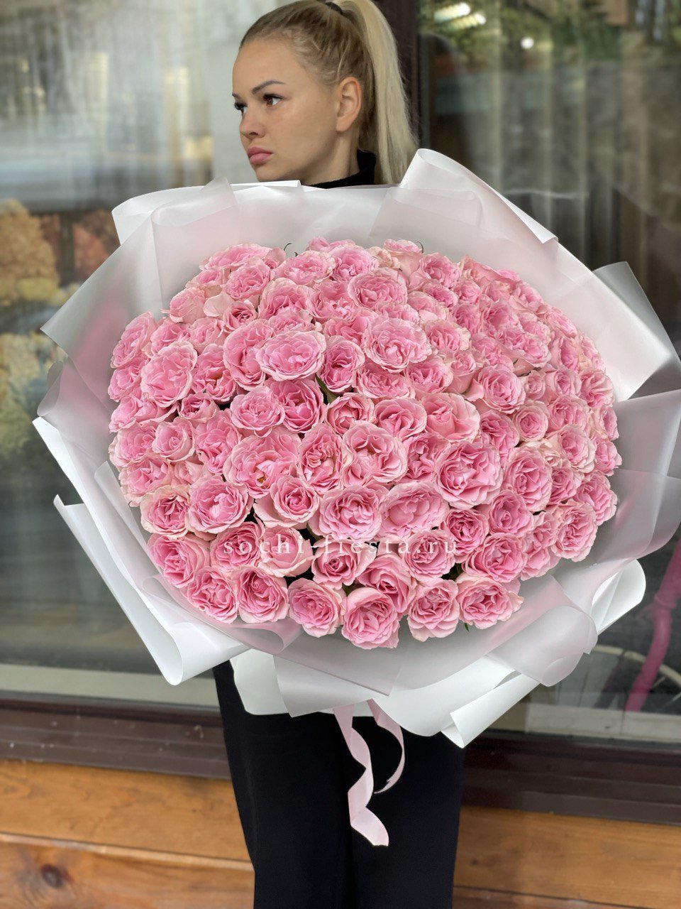 Розовые французские розы в воздушном оформлении дарят ощущение легкости и света. Двадцать пять бутонов создают объемное облако, которое наполняет пространство свежестью и теплом.