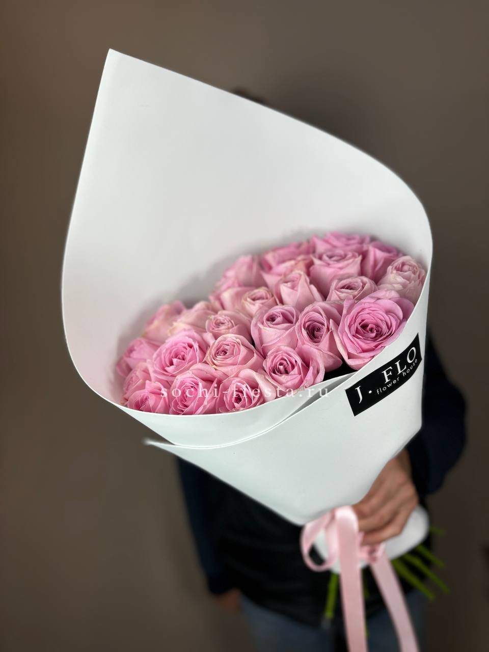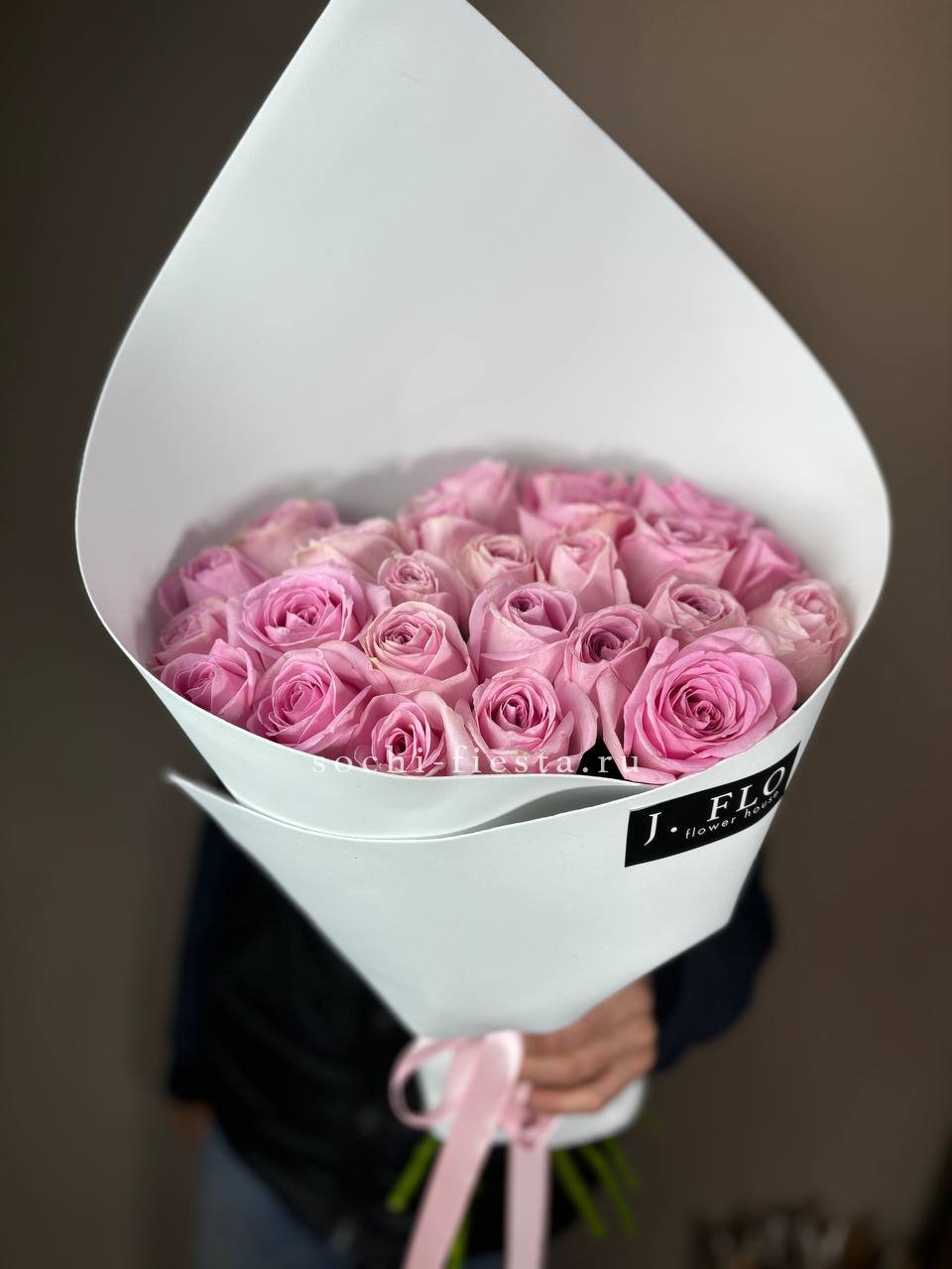 25 розовых роз., лента, дизайнерская упаковка.