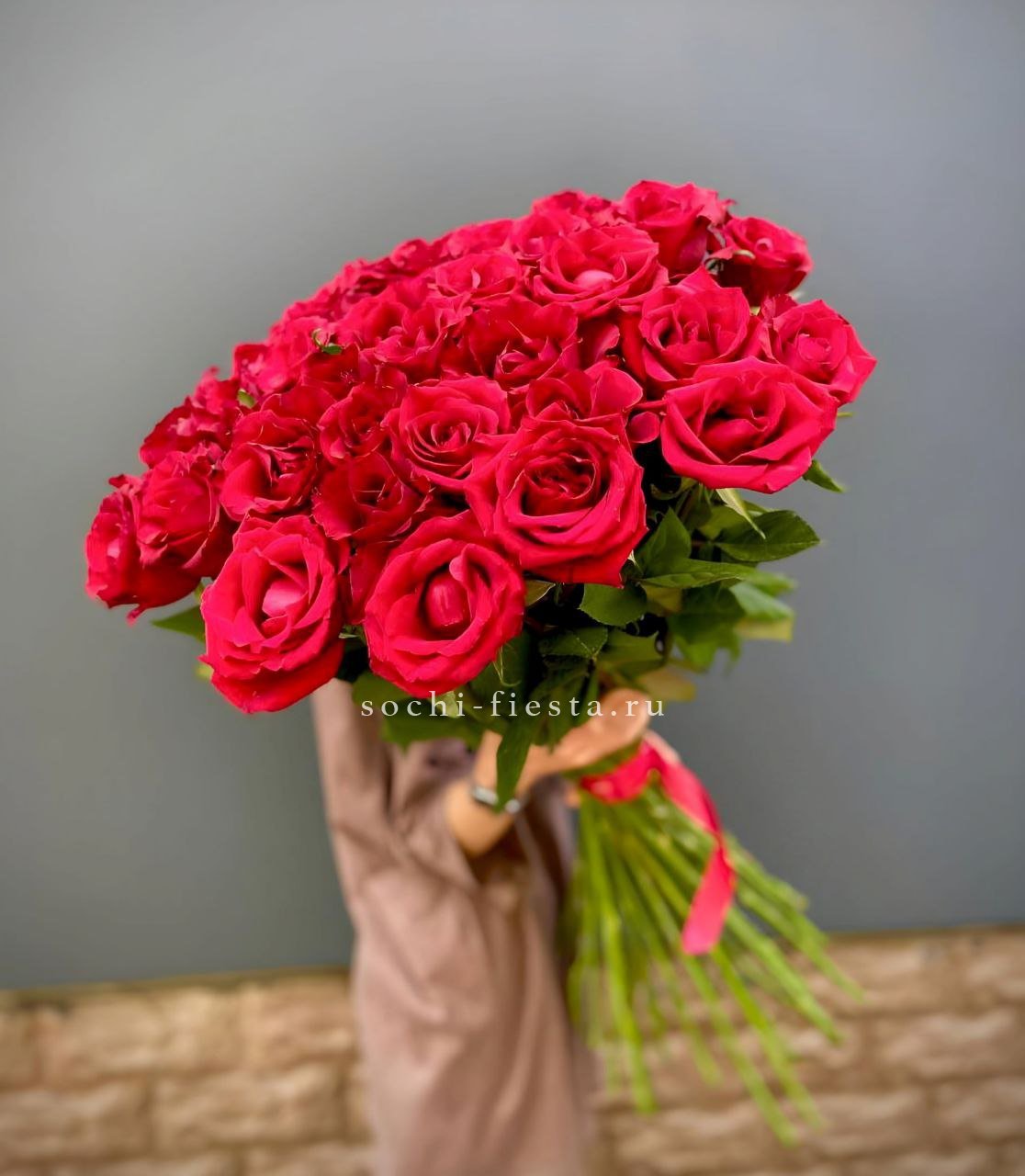 Двадцать пять красных роз собраны в плотный монохромный букет. Глубокий алый оттенок создаёт насыщенное цветовое пятно, которое притягивает внимание и наполняет пространство энергией.