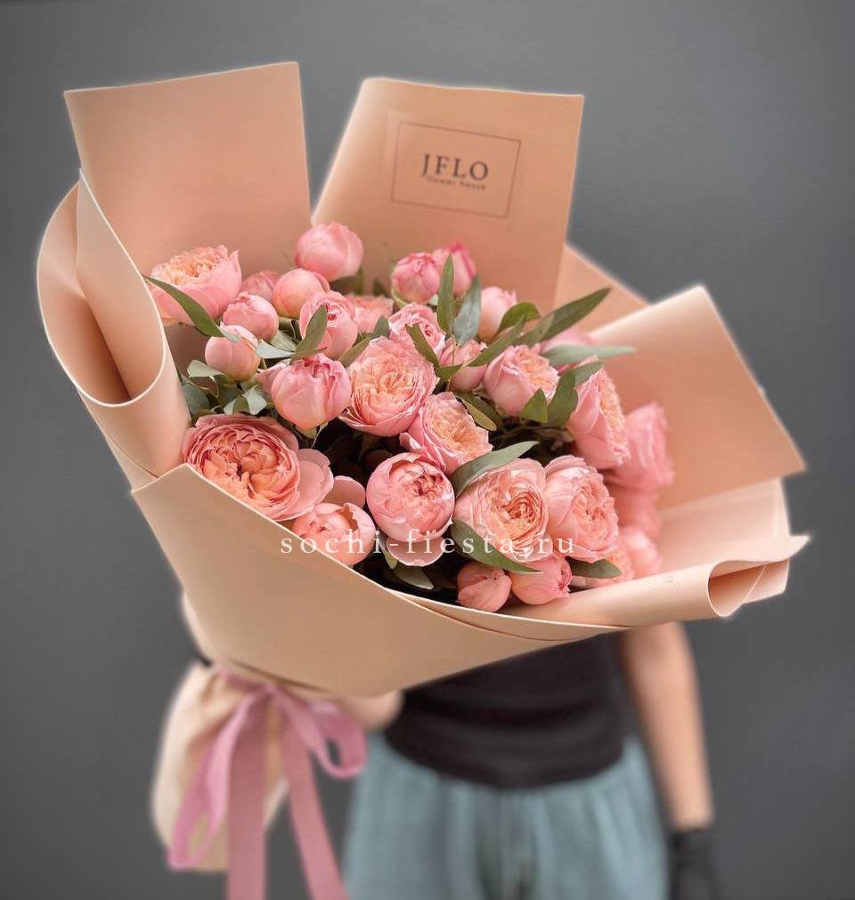 яркий букет из 9 пионовидных кустовых роз с эвкалиптом.