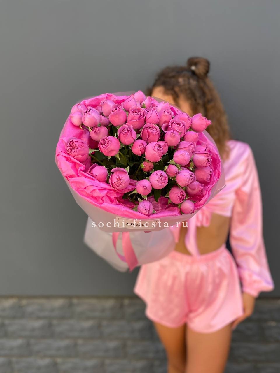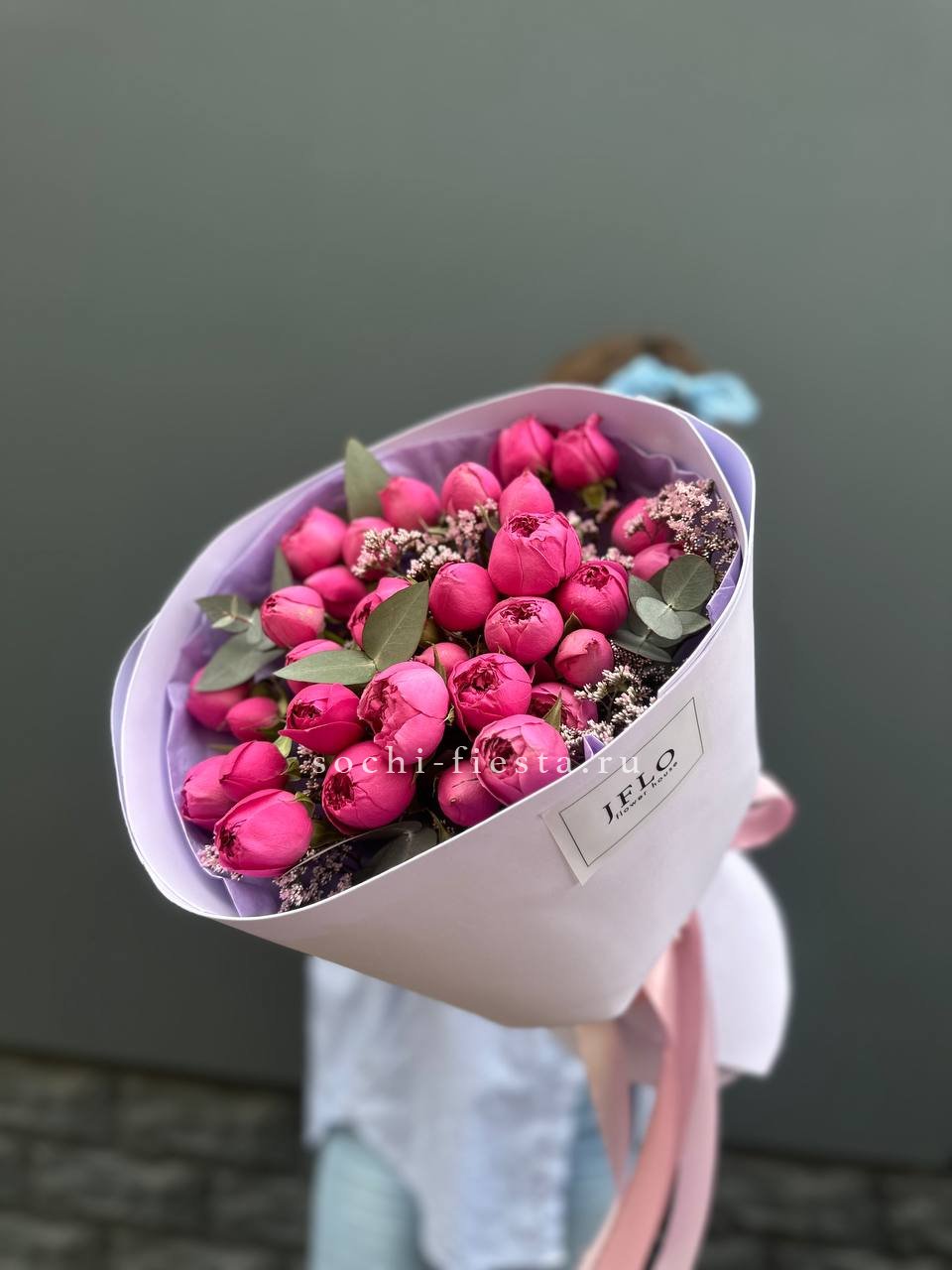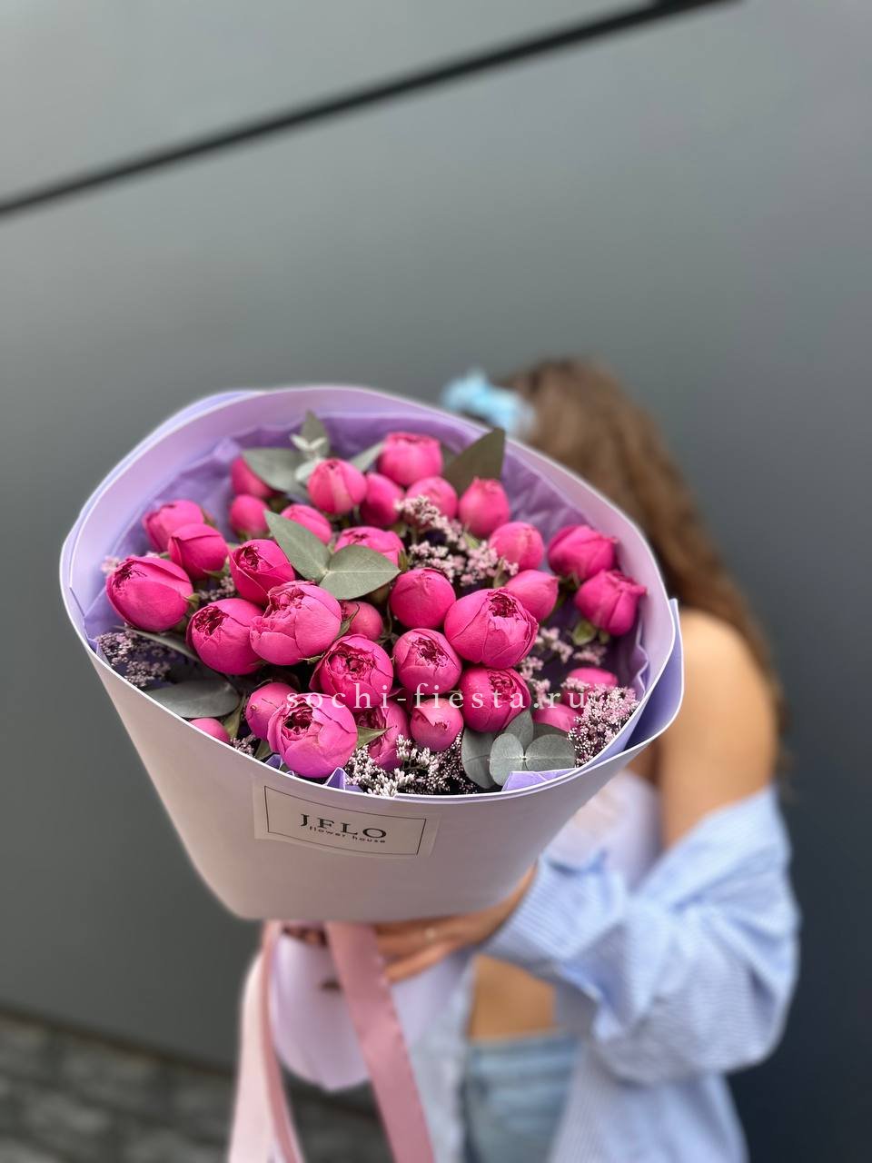 кустовая роза - 19 шт., эвкалипт, лента, дизайнерская упаковка.