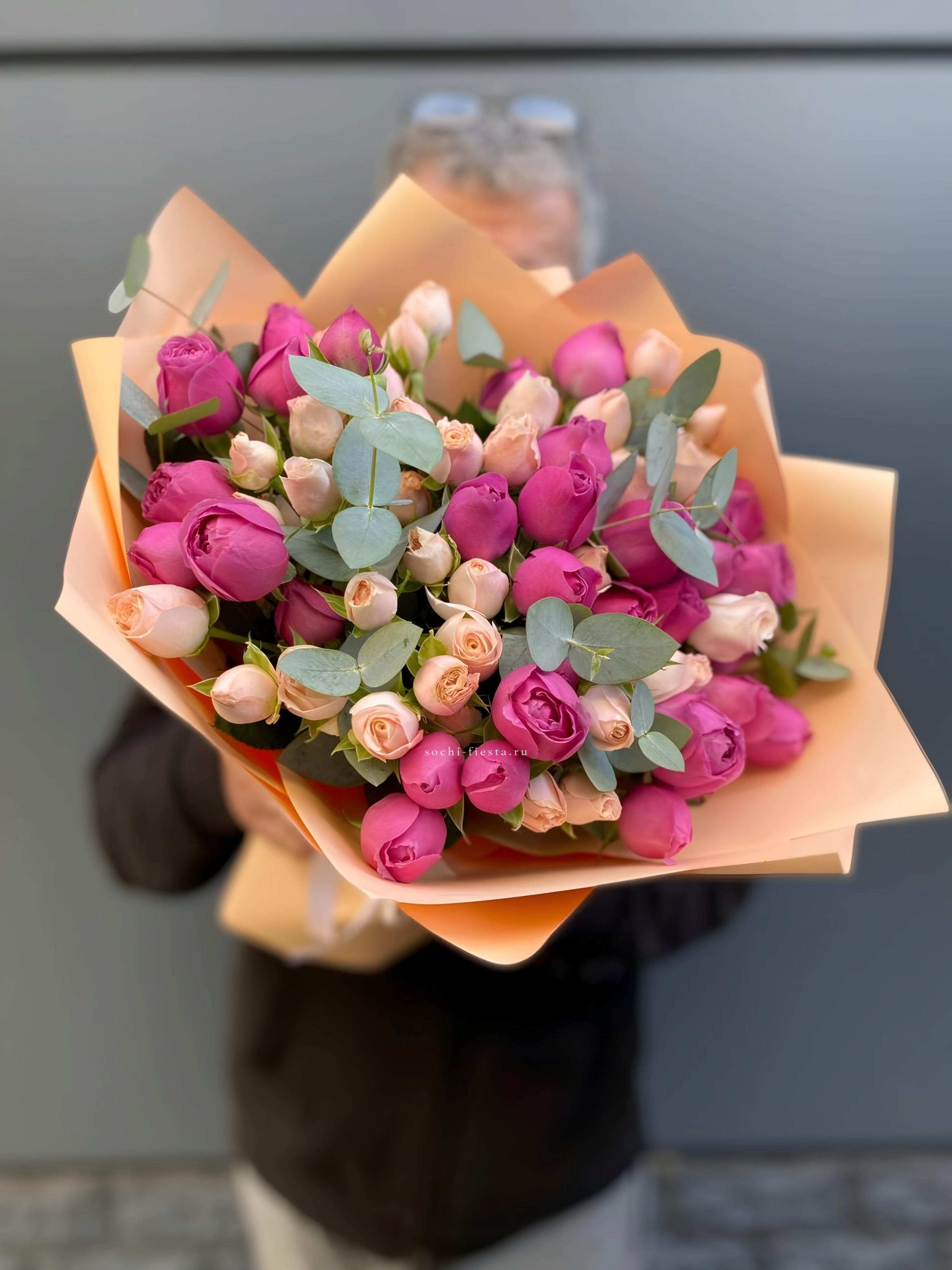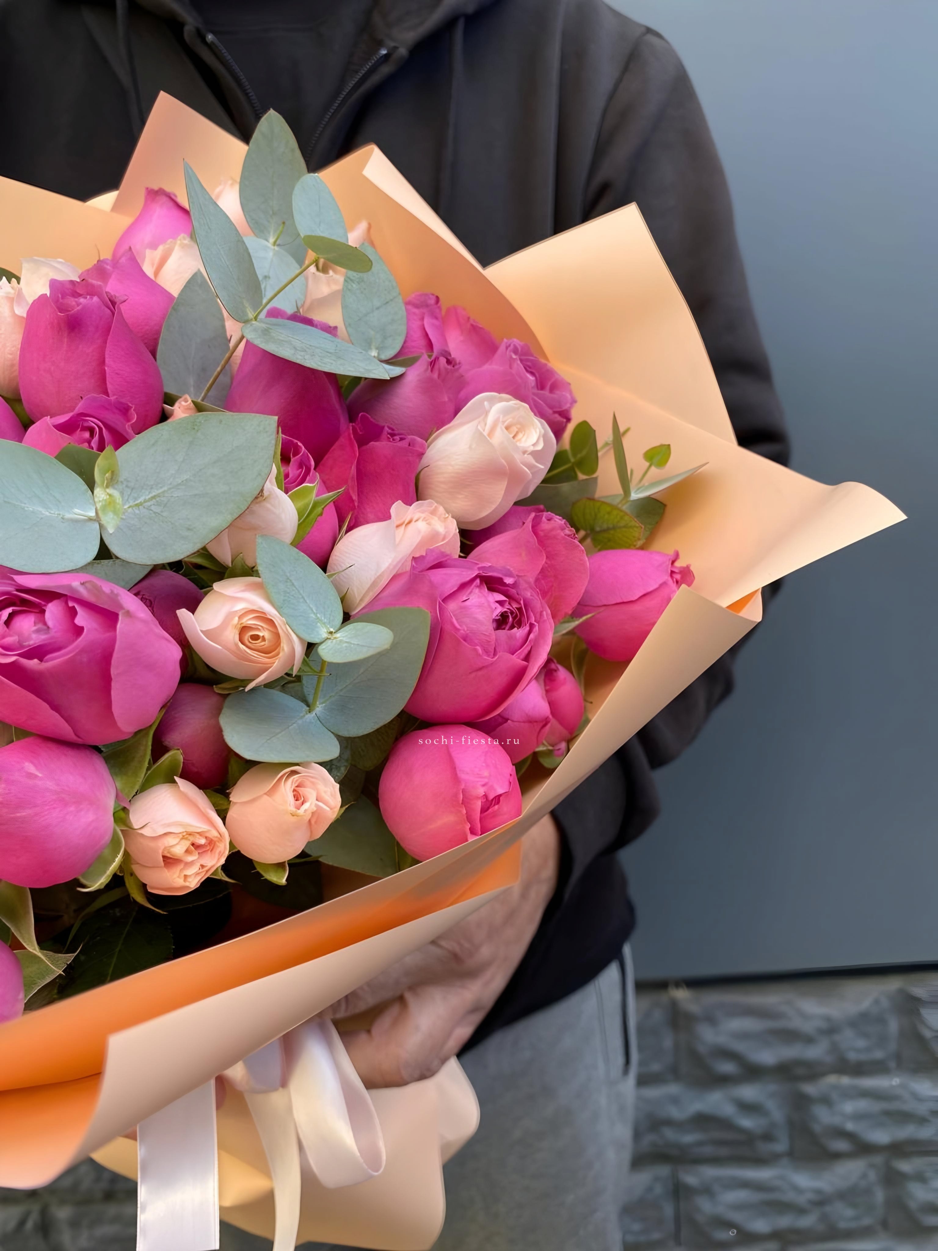пионовидная кустовая роза Мисти Баблс - 51 шт., эвкалипт 5 шт., хаммелациум (или аналог), лента, дизайнерская упаковка.