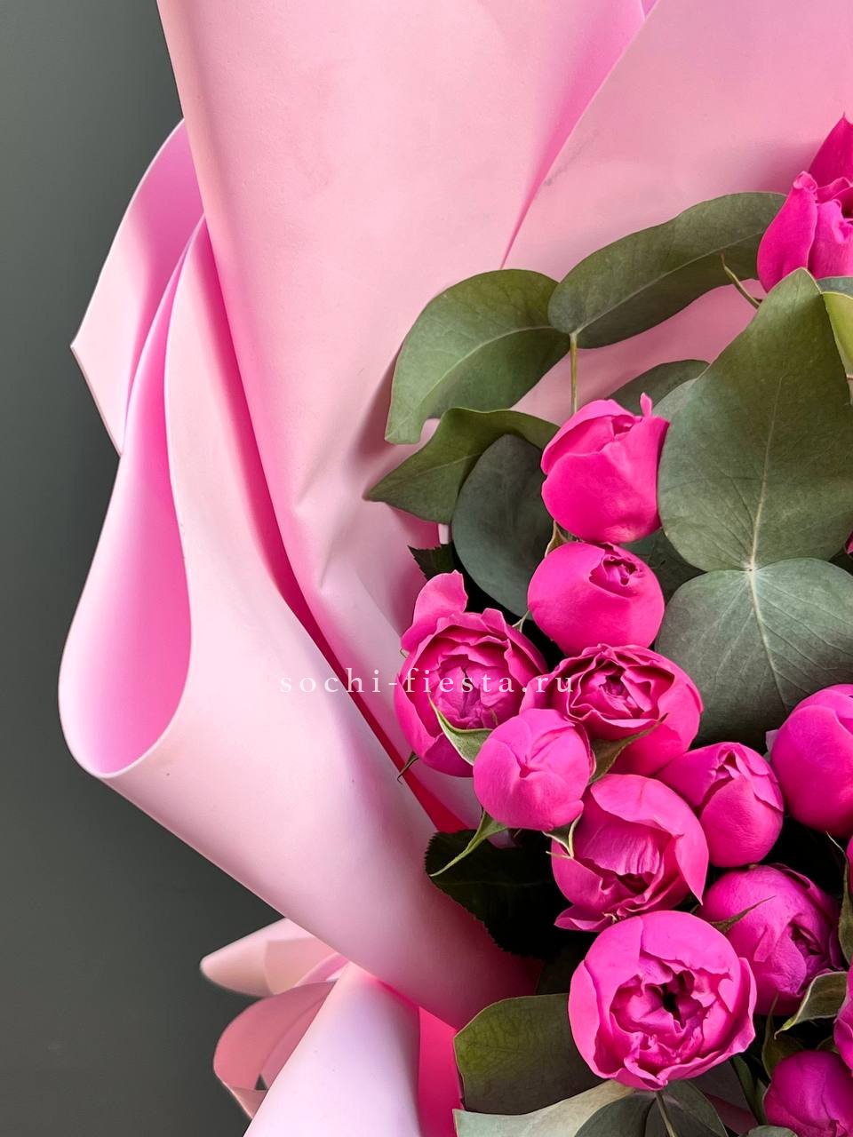Пионовидные розы с густыми округлыми бутонами в окружении серебристого эвкалипта. Плотная сборка и мягкая палитра создают впечатление спокойной гармонии.