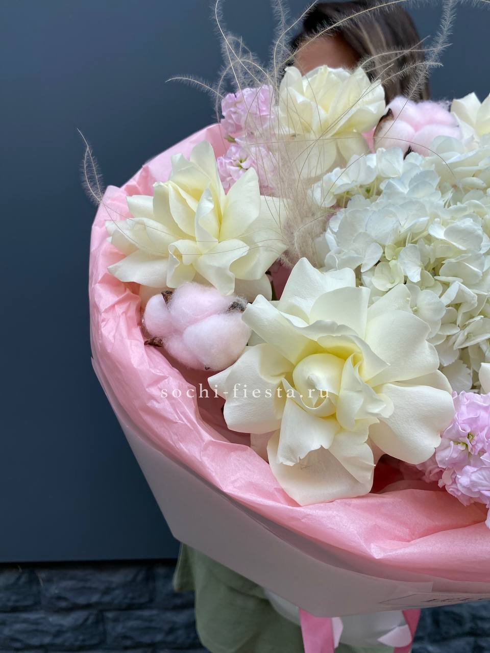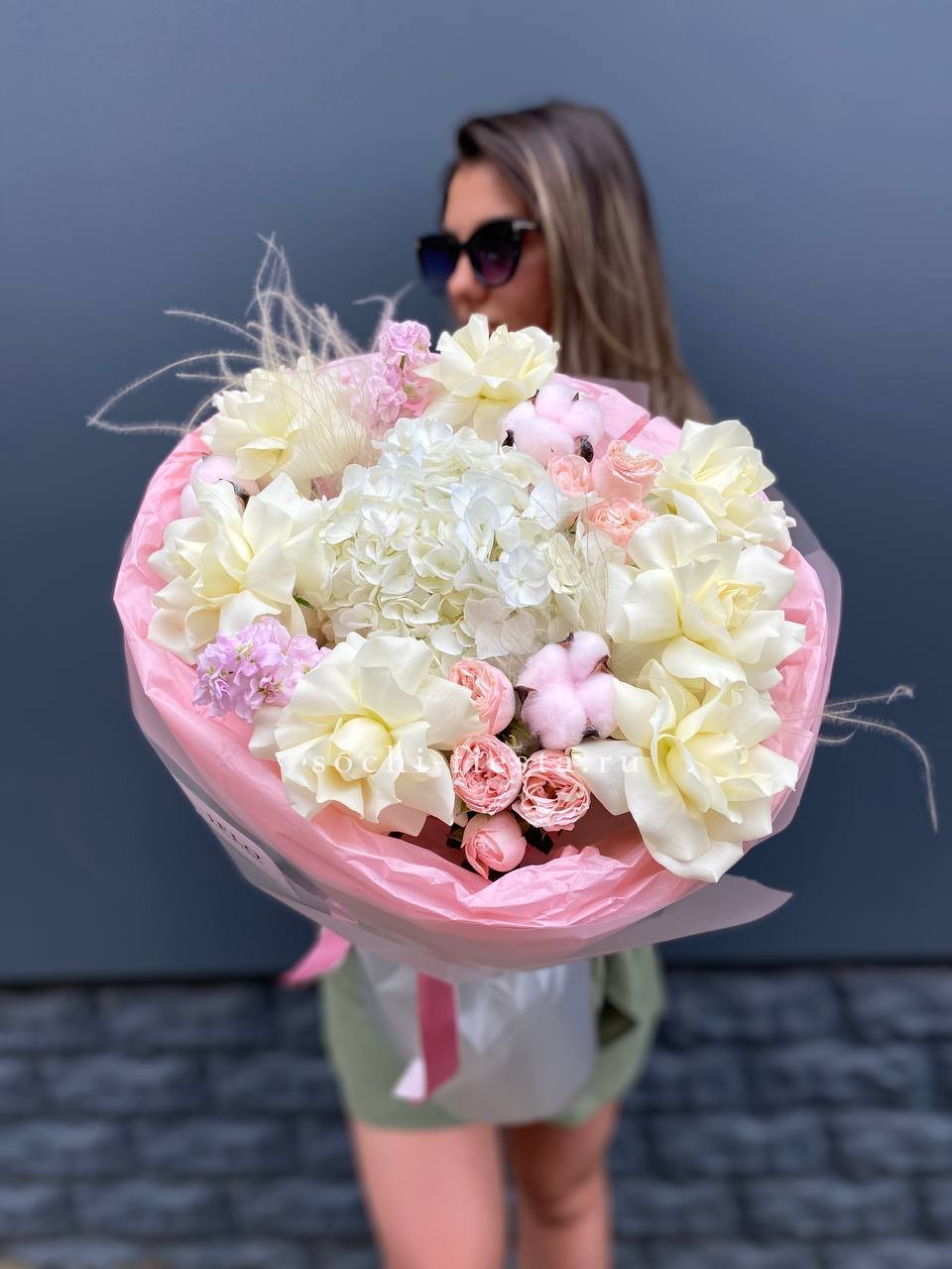 гортензия, герберы, эустомы, розы, диантус, эвкалипт, лента, дизайнерская упаковка.