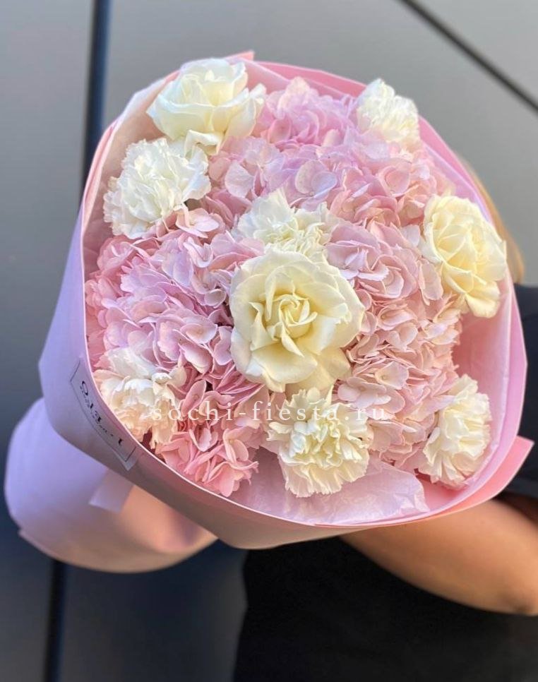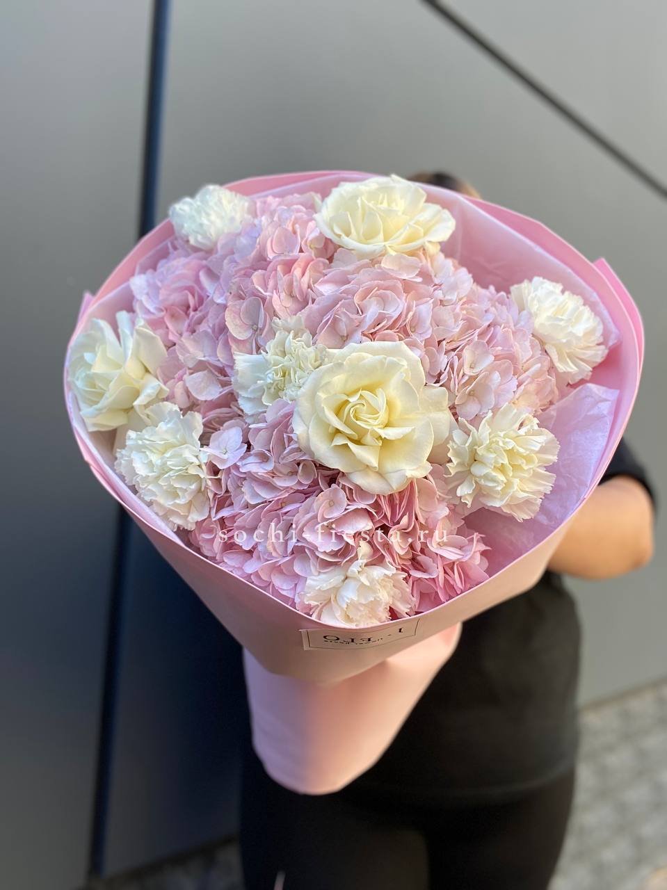 гортензия, розы джумилия, бомбастик, альстромерия, маттиола, чико, авторское оформление.