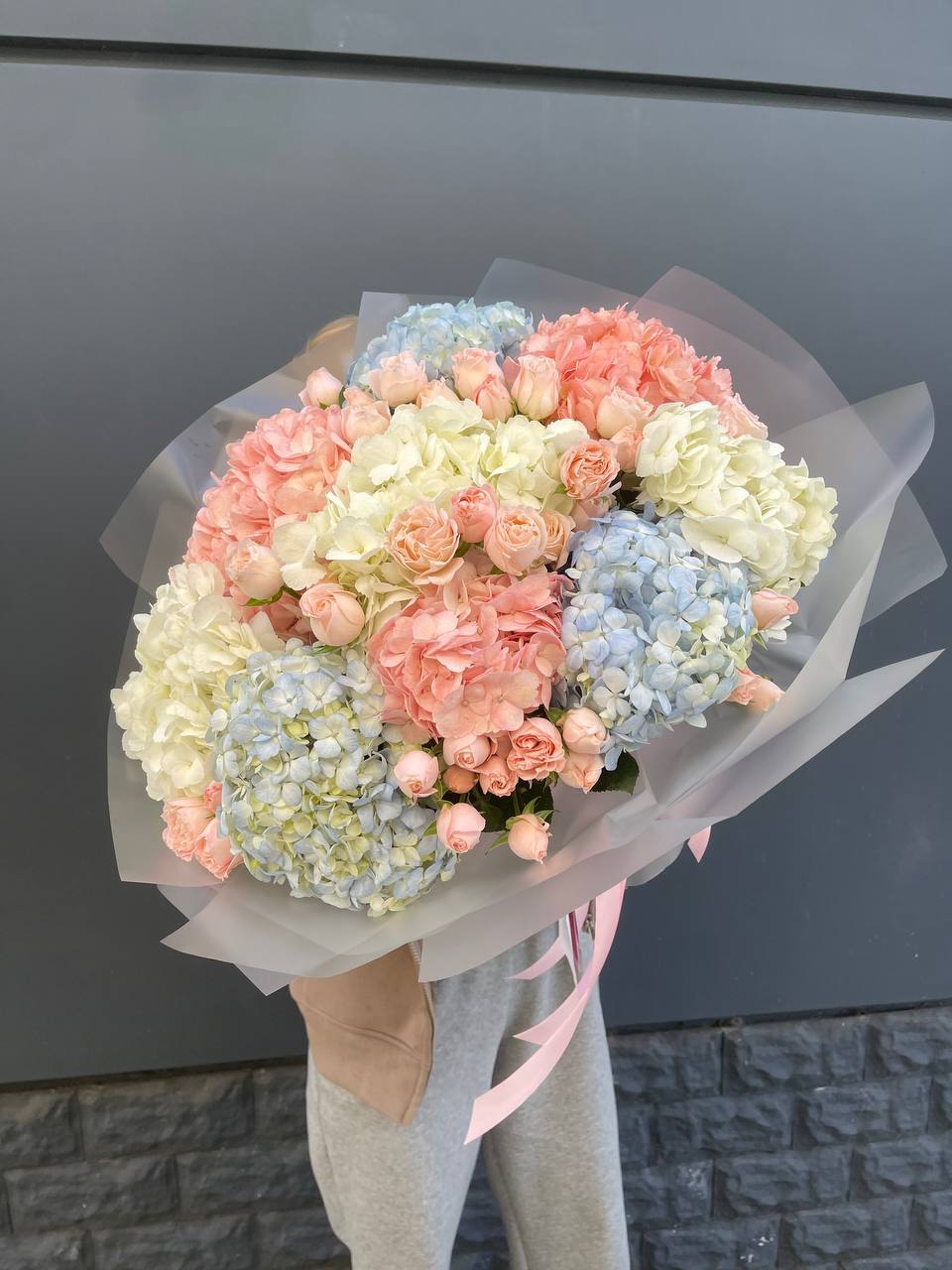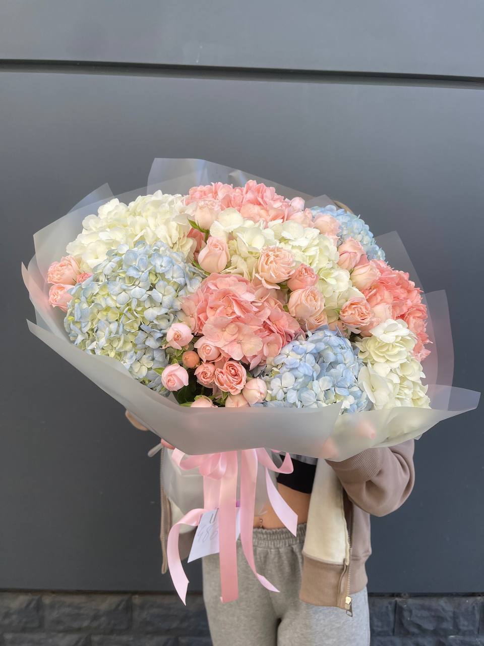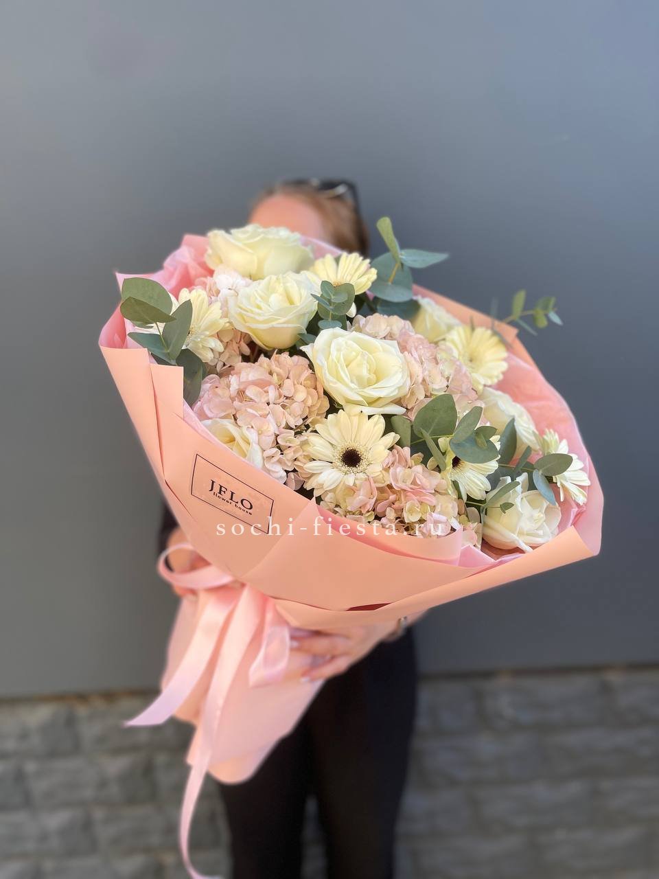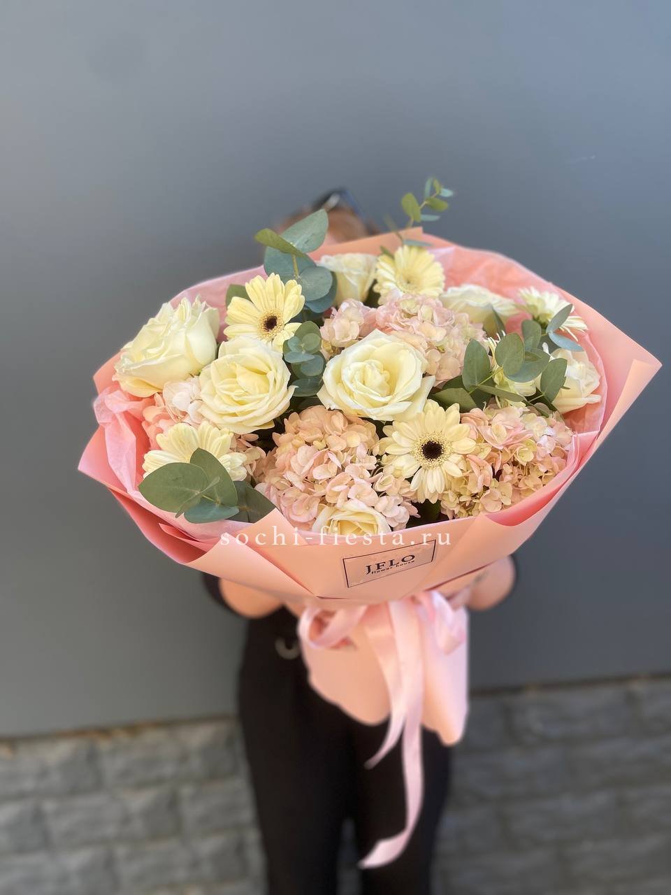 Воздушная композиция с пышной гортензией и розами Джумилия создает объемный силуэт. Маттиола и альстромерия добавляют легкости, а бомбастик вносит яркие акценты в общую структуру букета.
