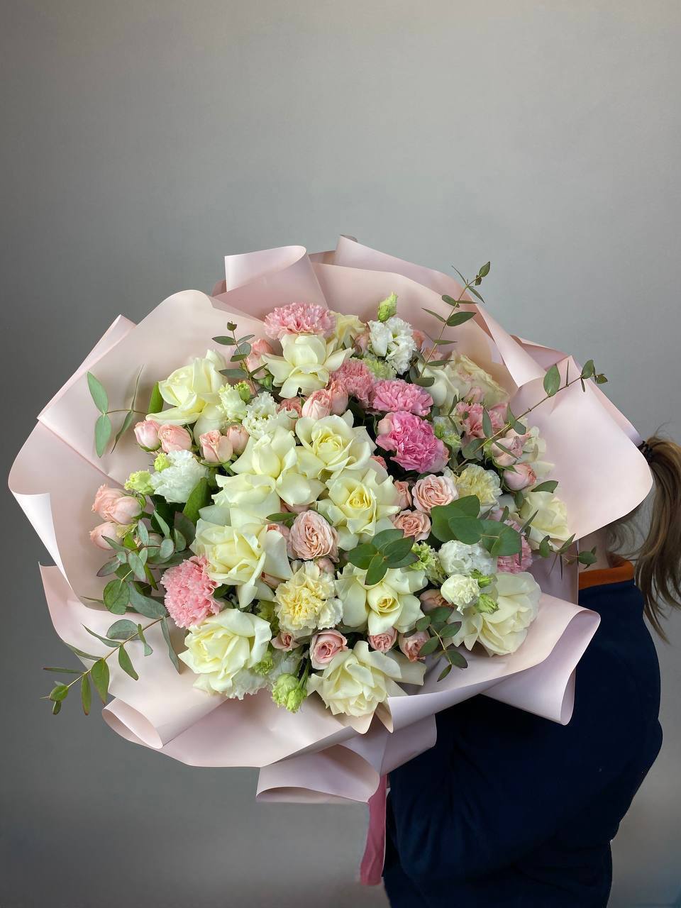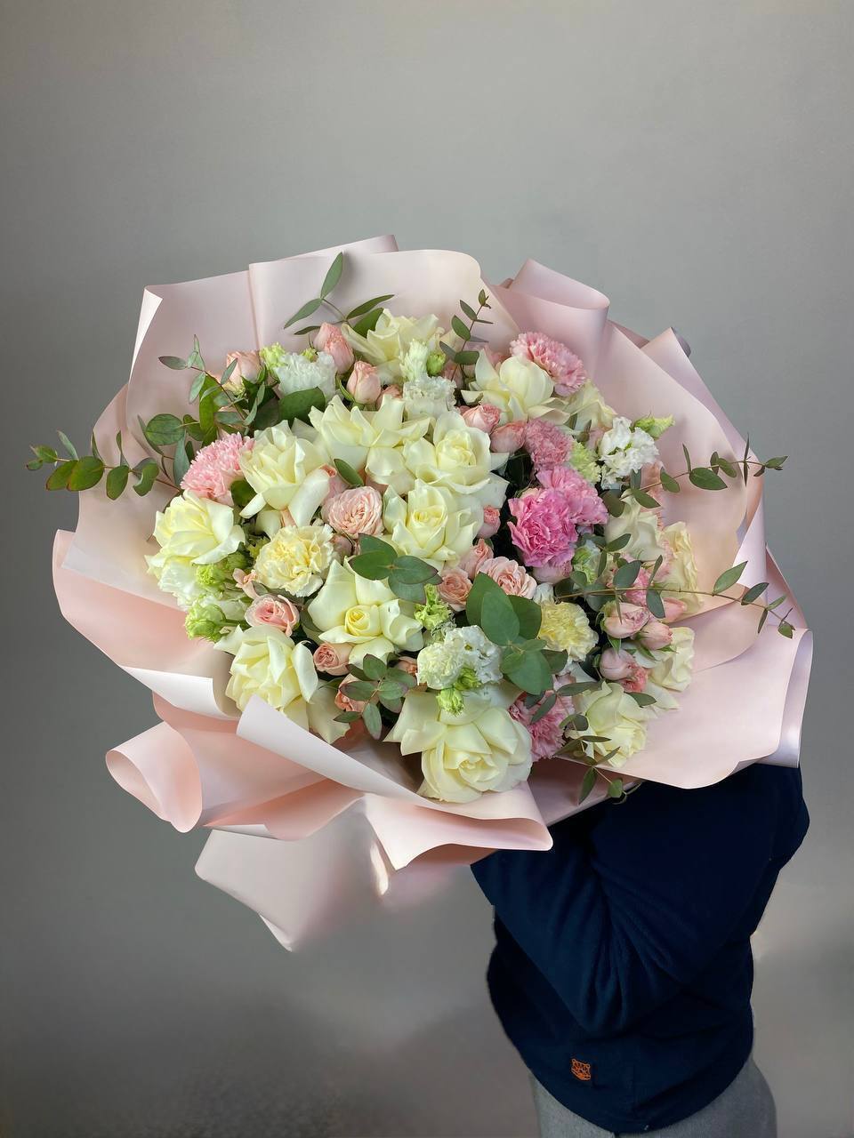 Диантусы создают воздушную текстуру между крупными бутонами роз в розовой и белой гамме. Эвкалипт добавляет графичности и свежести всей композиции.