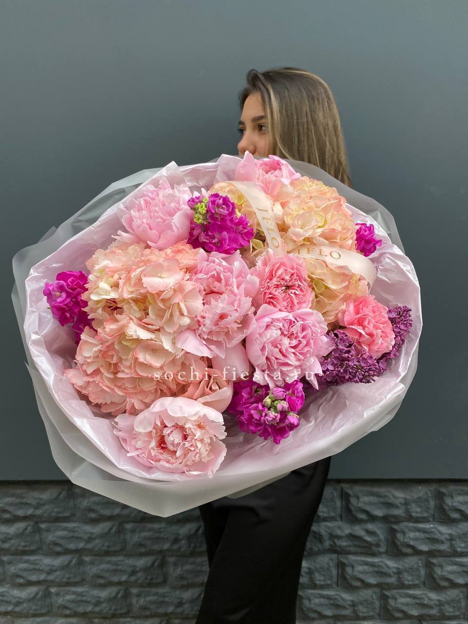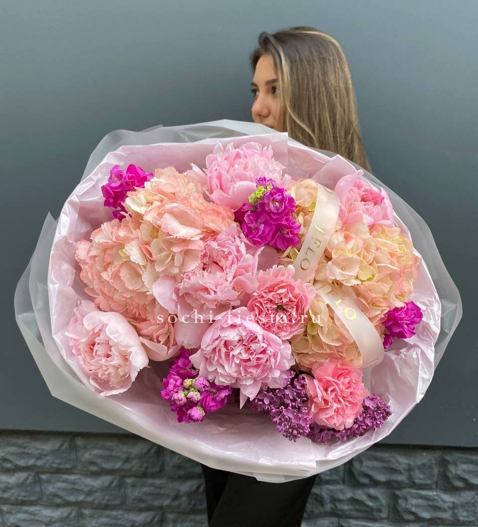 пионы, гортензии, диантусы, маттиола лента и дизайнерская пленка.