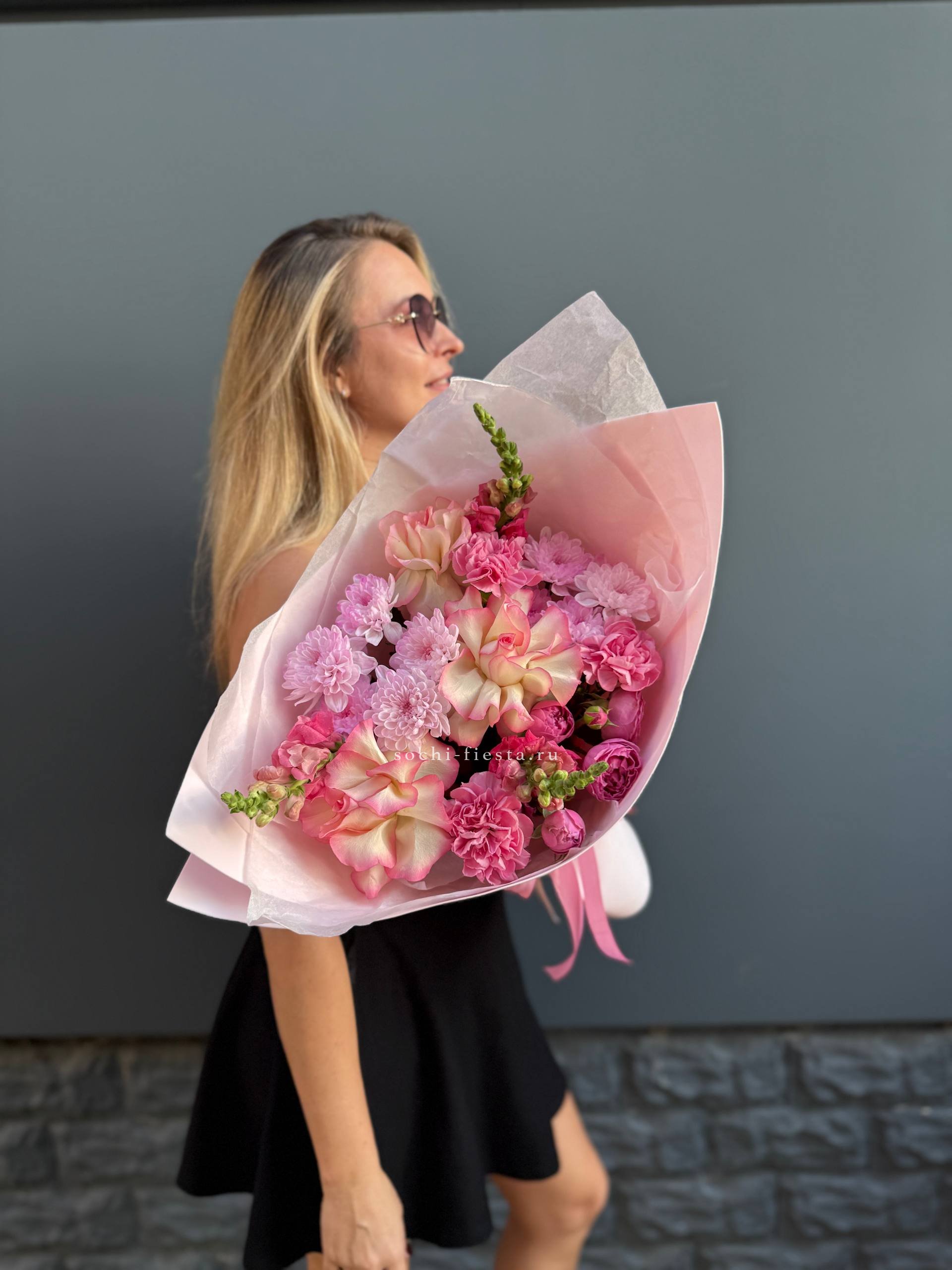 джумилия, хризантема, антиринум, диантус, мисти баблс, упаковка.