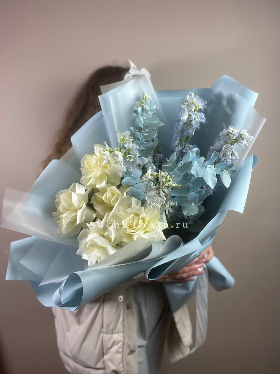 Вывернутые французские розы образуют плотную светлую сферу, которую прорезают вертикали синего дельфиниума. Эвкалипт добавляет графику по краю, создавая четкую границу между белым и зеленым.