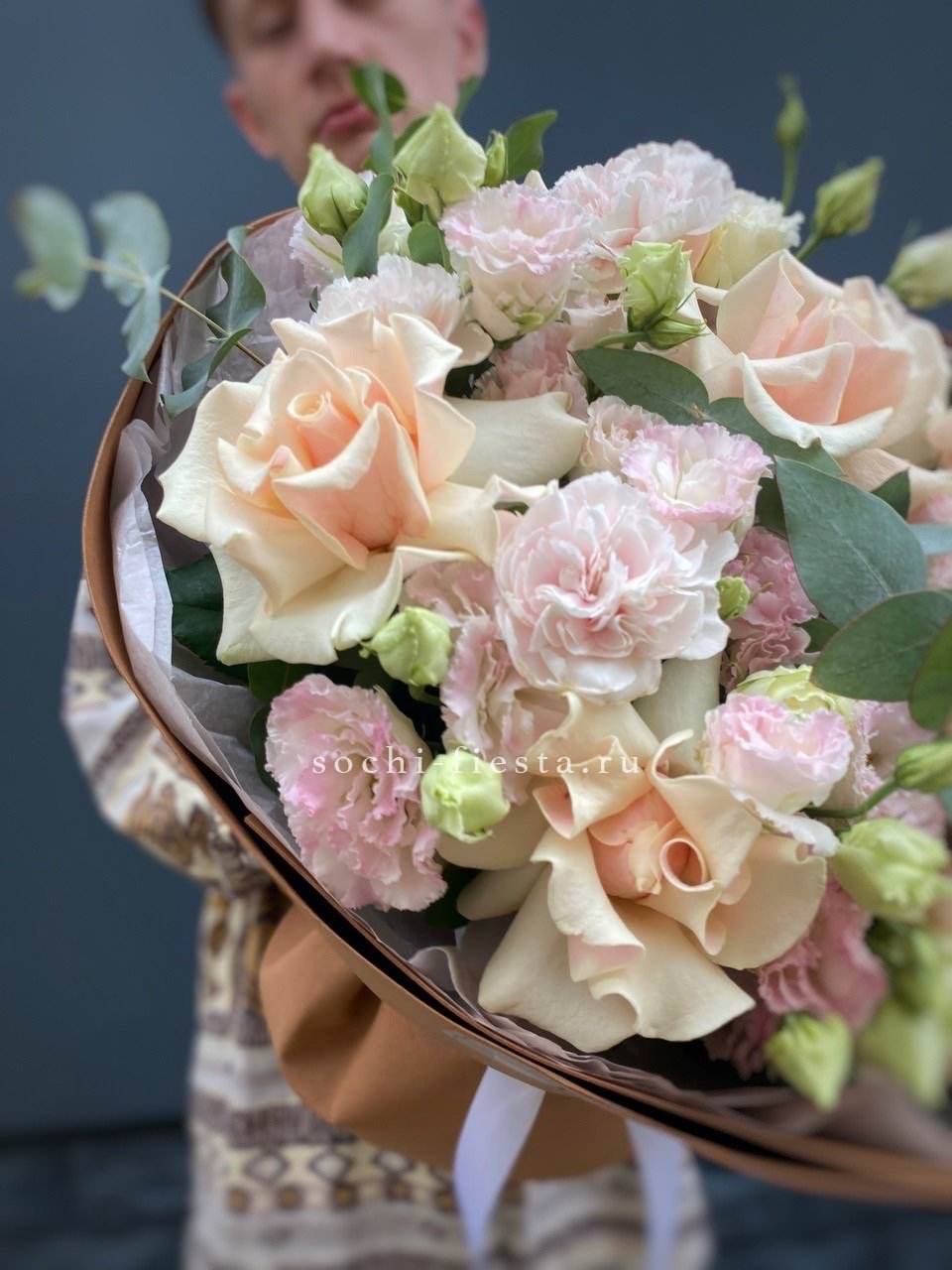 Кремовая палитра с лёгкими переходами в оттенках капучино создаёт спокойное и обволакивающее впечатление. Эустома и диантус добавляют воздушности, а эвкалипт завершает композицию мягкими зелёными нотами.