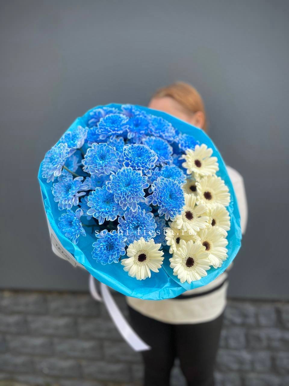 Воздушные соцветия лагуруса создают мягкую дымку вокруг роз и хризантем. Букет собран с ощущением лёгкости и простора, словно морской бриз коснулся каждого лепестка.