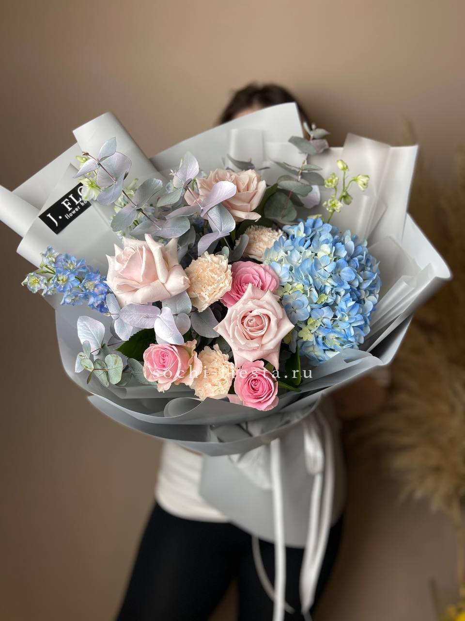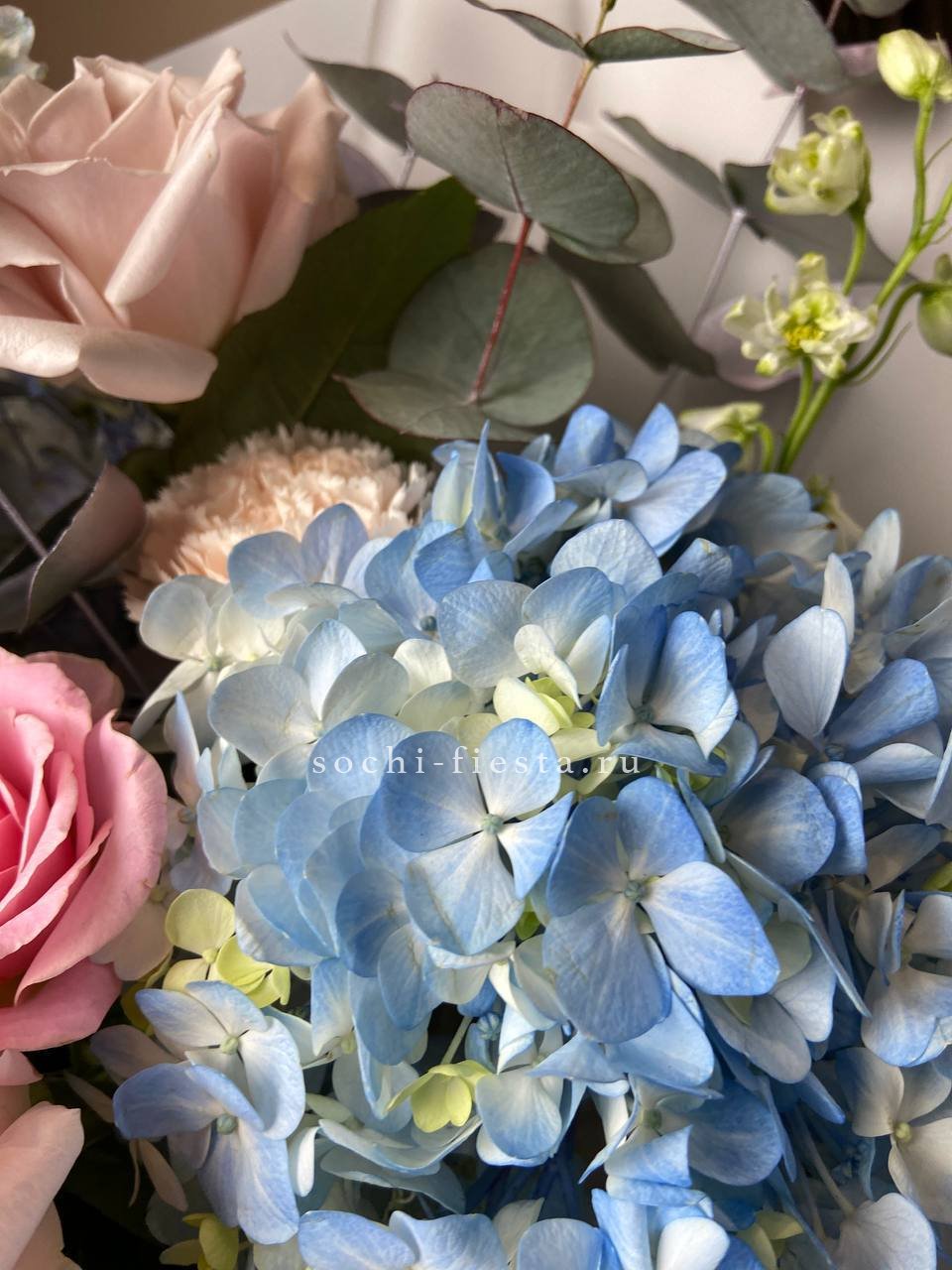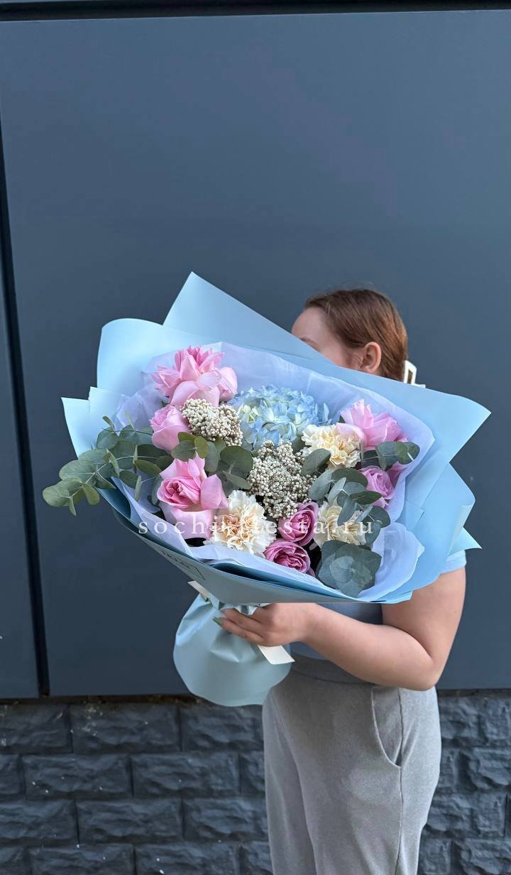 гортензия, бомбастик, диантусы, эвкалипт, антиринум, хризантема, пленка.