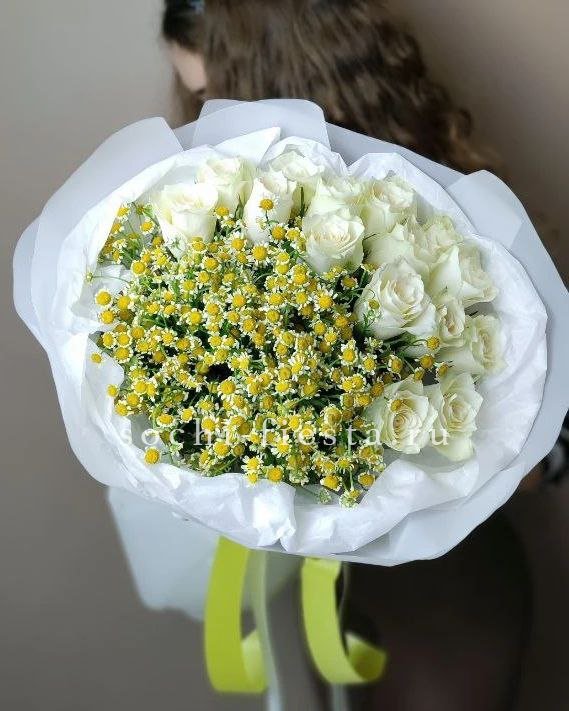 ромашки (танацетум камилла) , розы, лента, упаковка.