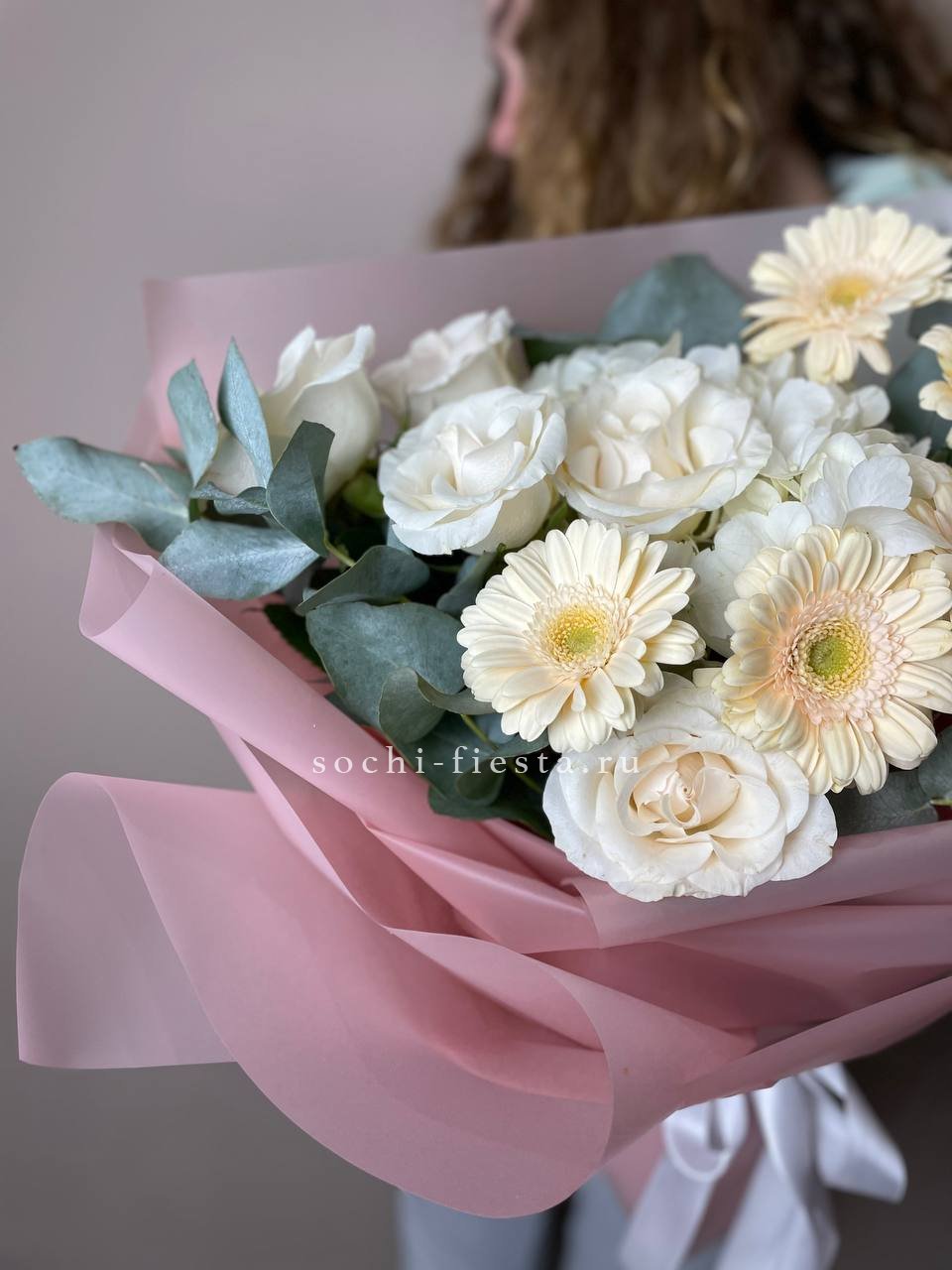 гортензия, гербера, роза, эвкалипт, оформление, лента.
