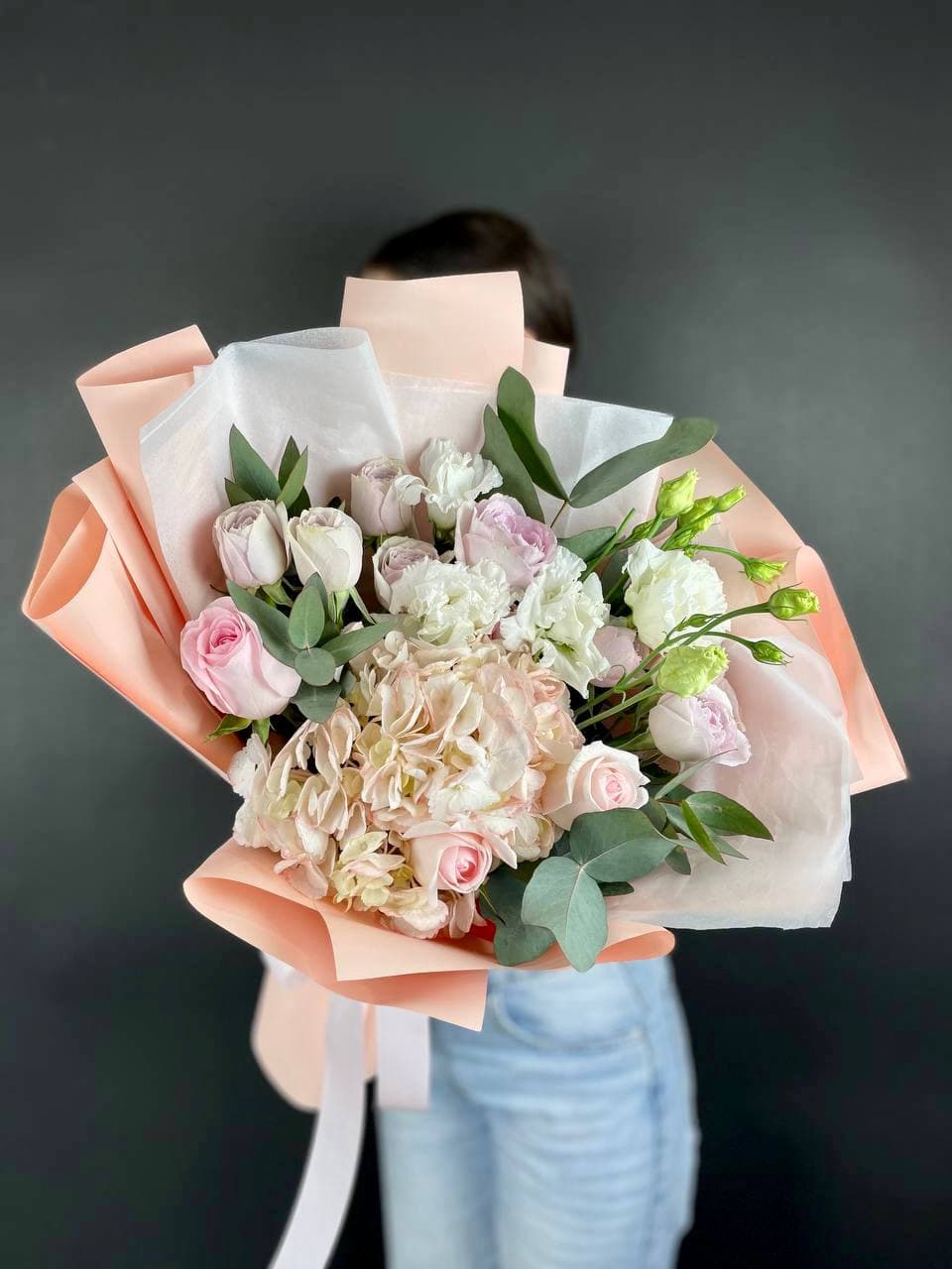 Пышные шапки гортензии задают основной объём, а бутоны роз и эустомы расставлены между ними с лёгкой небрежностью. Эвкалипт добавляет свежести и делает композицию живой.