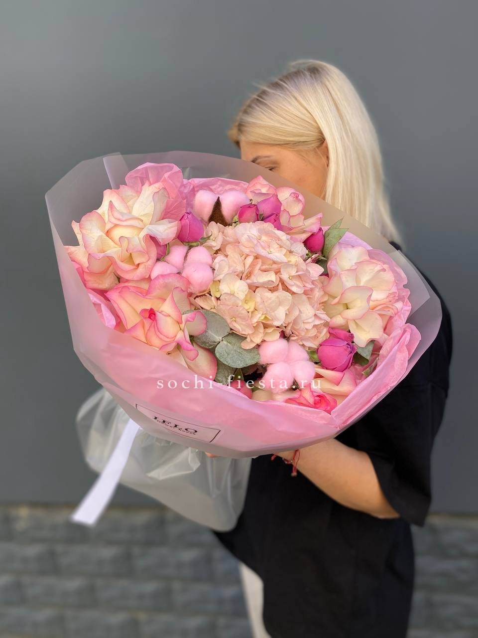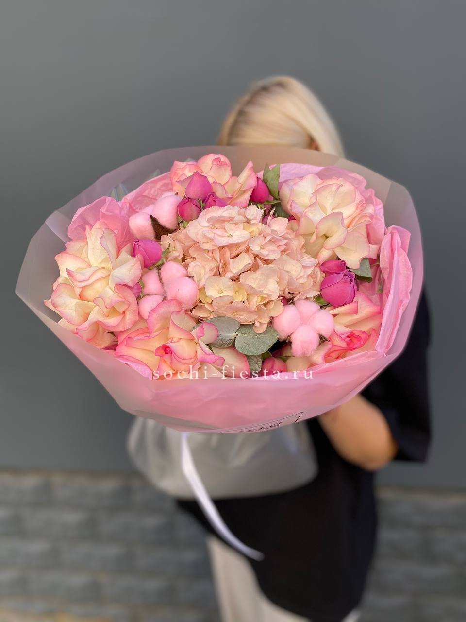 розовые розы, белые розы, диантус, бомбастик, гортензия, эвкалипт, пленка.