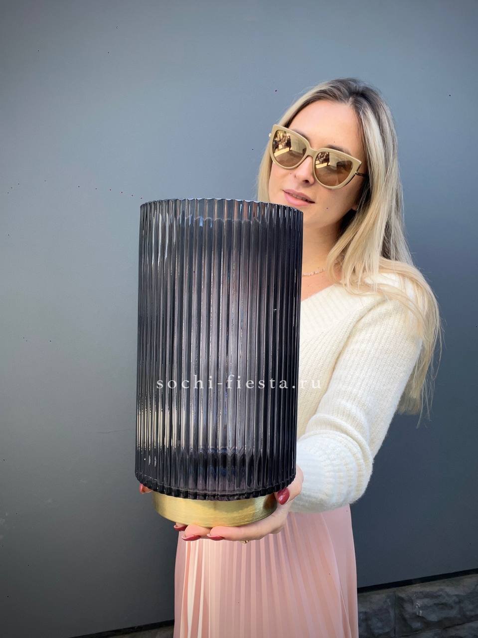 стеклянная ваза под цветы элегантное и стильное дополнение к интерьеру. Серый оттенок создаст уютную атмосферу, а бронзовая окантовка дна из латуни обеспечит долговечность изделия. В вазу можно наливать воду под живые цветы или ставить сухоцветы. Материал: стекло. Цвет: серый. Размер: 15х28 см (ШВ). Диаметр горлышка: 14 см. Объем: 3000 мл.