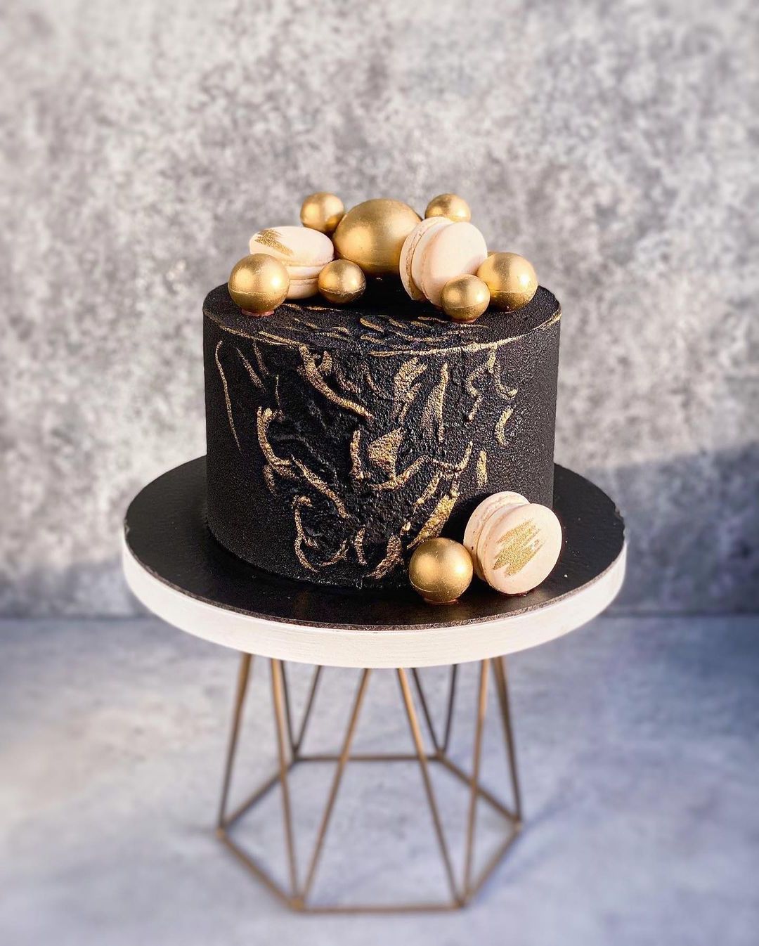 Глубокий чёрный слой крема переходит в белоснежные акценты и золотые детали. Торт выглядит графично и собранно.